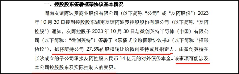 友阿股份近期發(fā)布公告稱,控股股東湖南友誼阿波羅控股股份有限公司友阿控股于10月30日與微創(chuàng)英特半導(dǎo)體(中國(guó))有限公司(簡(jiǎn)稱:“微創(chuàng)英特”)簽署了《承債式收購(gòu)框架協(xié)議書(shū)》。 根據(jù)框架協(xié)議,友阿控股擬將所持友阿股份27.5%的股權(quán)轉(zhuǎn)讓給微創(chuàng)英特或其指定人,由微創(chuàng)英特在長(zhǎng)沙成立的子公司承接友阿控股14億元的對(duì)外債務(wù)本金。該事項(xiàng)可能涉及友阿股份控股股東及實(shí)際控制人的變更。 在友阿股份的股權(quán)轉(zhuǎn)讓給微創(chuàng)英特后,友阿控股在重大決策事宜方面與微創(chuàng)英特保持一致,友阿控股配合微創(chuàng)英特以友阿股份或子公司名義對(duì)外展開(kāi)收購(gòu)或并購(gòu)的相關(guān)業(yè)務(wù)。微創(chuàng)英特必須在3至12個(gè)月內(nèi)完成不低于10億元市值的儲(chǔ)能、光伏、新能源、大數(shù)據(jù)、充電樁等相關(guān)業(yè)務(wù)的資產(chǎn)注入,友阿股份原有業(yè)務(wù)版塊以租賃或承包經(jīng)營(yíng)的方式交給原團(tuán)隊(duì)負(fù)責(zé)運(yùn)營(yíng)。 資料顯示,微創(chuàng)英特的是微創(chuàng)集團(tuán)有限公司的全資子公司。友阿股份在投資者互動(dòng)平臺(tái)稱:微創(chuàng)英特為控股股東交易對(duì)手方,公司對(duì)其財(cái)務(wù)情況不了解。同時(shí)表示,微創(chuàng)英特與港股上市公司微創(chuàng)醫(yī)療不存在關(guān)聯(lián)關(guān)系。 |