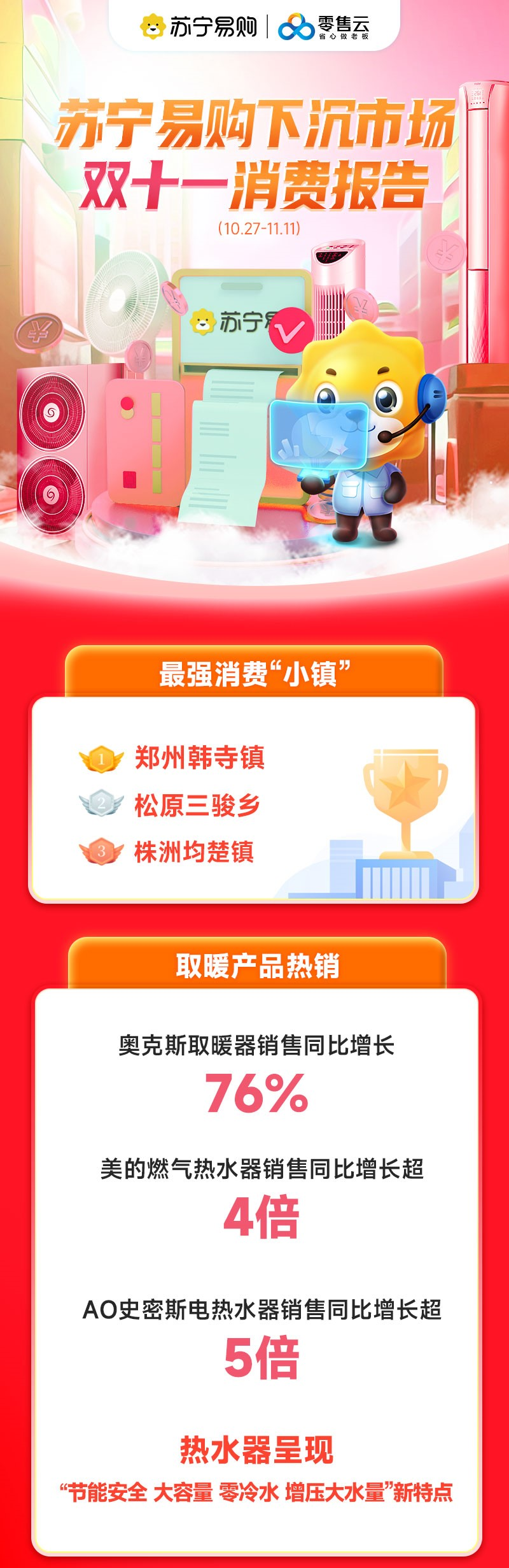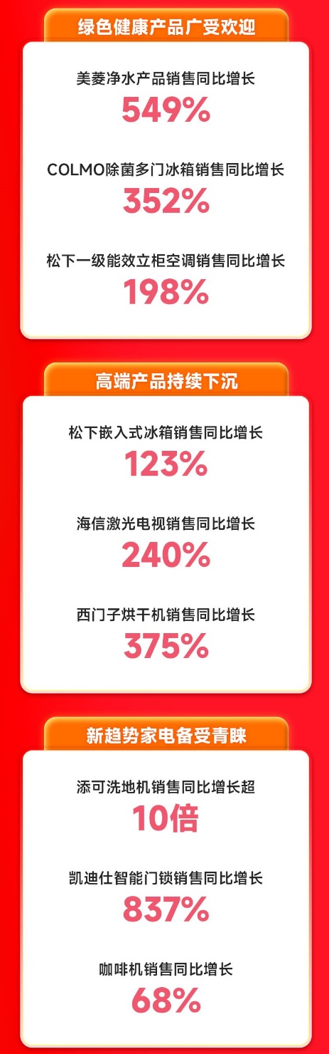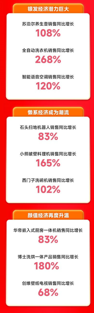 11月11日,蘇寧易購發(fā)布雙11下沉市場消費報告指出,縣域市場呈現(xiàn)出“銀發(fā)、懶系、顏值”三大消費新趨勢,“取暖、綠色、高端、新趨勢”四類產(chǎn)品在縣鎮(zhèn)市場熱銷。雙11期間,零售云數(shù)據(jù)顯示:美的燃?xì)鉄崴麂N售同比增長超4倍,COLMO除菌多門冰箱增長352%,西門子烘干機(jī)增長375%,海信激光電視增長240%,添可洗地機(jī)增長超10倍。 近期,全國多輪冷空氣“吹熱”抗寒取暖產(chǎn)品銷售市場。零售云數(shù)據(jù)顯示:奧克斯取暖器銷售同比增長76%,同時,熱水器消費呈現(xiàn)出“節(jié)能安全、大容量、零冷水、大水量”四大消費新趨勢,雙11期間,美的燃?xì)鉄崴、AO史密斯電熱水器銷售分別增長4倍、5倍。 今年雙11,縣鎮(zhèn)消費者更多選擇一級能效、智能操作、利于健康的家電產(chǎn)品。零售云相關(guān)負(fù)責(zé)人透露,從數(shù)據(jù)來看,美菱凈水產(chǎn)品、COLMO除菌多門冰箱、松下一級能效立柜空調(diào)銷售同比增長549%、352%、198%。 在縣鎮(zhèn)市場,高端智能化、新趨勢化家電需求日益旺盛。零售云數(shù)據(jù)顯示:添可洗地機(jī)銷售同比增長超10倍,凱迪仕智能門鎖、咖啡機(jī)銷售同比增長837%、68%。同時,松下嵌入式冰箱、海信激光電視、西門子烘干機(jī)銷售分別增長123%、240%、375%。 中國老齡科學(xué)研究中心發(fā)布《中國老齡產(chǎn)業(yè)發(fā)展報告(2021—2022)》提到,2050年我國老年人口數(shù)量將達(dá)到4.8億,“銀發(fā)經(jīng)濟(jì)”在下沉市場中將會有更大增長空間。零售云數(shù)據(jù)顯示:蘇泊爾養(yǎng)生壺、全自動洗衣機(jī)、智能語音空調(diào)銷售分別增長108%、268%、120%。 在“懶系經(jīng)濟(jì)”消費趨勢的帶動下,智能家電更加“內(nèi)卷”,掃地機(jī)器人、破壁機(jī)、洗碗機(jī)已經(jīng)成為“懶系青年”的生活搭子。零售云數(shù)據(jù)顯示:石頭掃地機(jī)器人、小熊破壁料理機(jī)、西門子洗碗機(jī)銷售增長83%、165%、102%。同時,“悅己”消費理念不斷提升,消費者有了更多元化的進(jìn)階需求,“顏值經(jīng)濟(jì)”再度升溫。零售云數(shù)據(jù)顯示,華帝嵌入式廚房一體機(jī)、博士洗烘一體產(chǎn)品、創(chuàng)維壁紙電視銷售增長83%、180%、68%。 此外,雙11期間,為推動“家電家居煥新消費”,助力“鄉(xiāng)村振興”,蘇寧易購發(fā)布“新家電下鄉(xiāng)”計劃,通過“渠道建設(shè)、產(chǎn)品升級、服務(wù)優(yōu)化”三大策略,讓更多新趨勢家電走向鄉(xiāng)村。未來三年,蘇寧易購將在下沉市場布局30000店,實現(xiàn)家電下鄉(xiāng)超500億銷售規(guī)模,以舊換新補(bǔ)貼超2億元,開展超3萬場活動,幫助100萬個家庭家電換新,聯(lián)合百大頭部家電品牌打造300款高性價比的專屬定制產(chǎn)品。 蘇寧易購表示,雙11期間,零售云全國新開門店348家,其中Super旗艦店新開17家,加速多級市場的門店開拓與升級,為消費者帶來了更舒適的“逛購”新體驗。 |