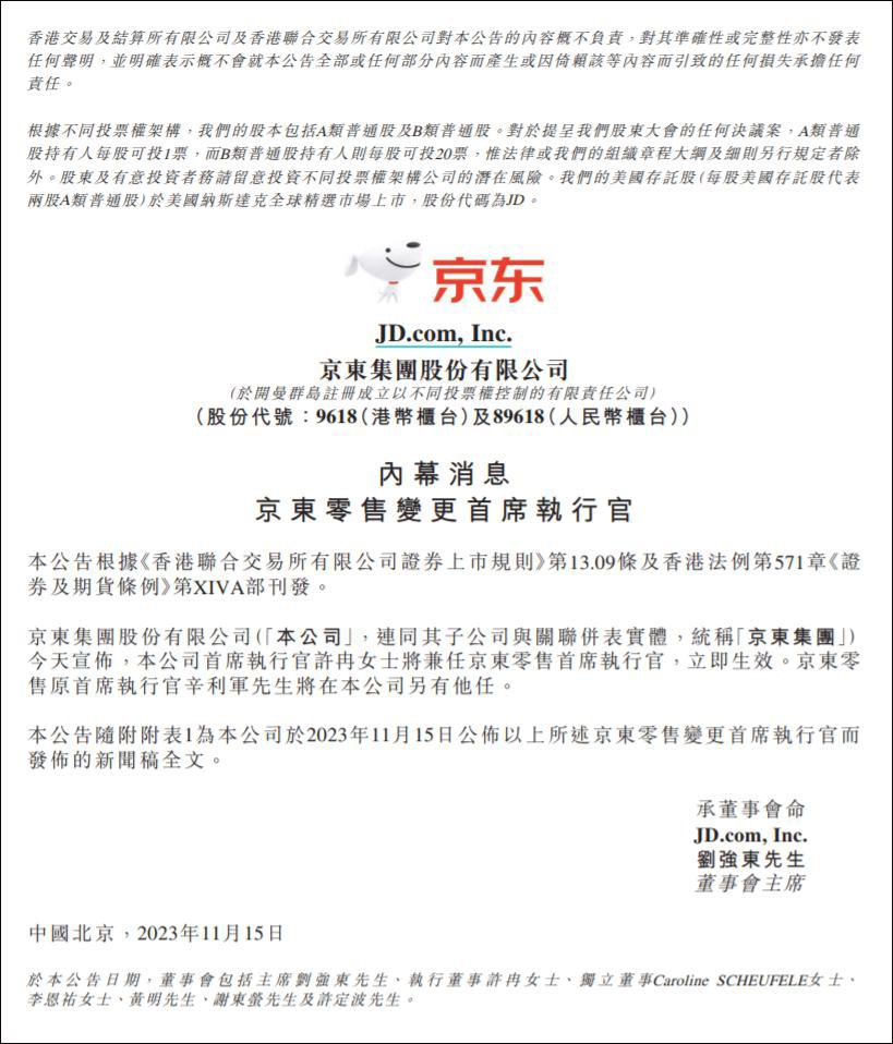 自2022年年末劉強(qiáng)東“回歸”后,京東開啟了一系列的組織變革。 11月15日,京東通過公告宣布旗下零售子集團(tuán)換帥,京東集團(tuán)CEO(首席執(zhí)行官)許冉將兼任京東零售集團(tuán)CEO,原京東零售集團(tuán)CEO辛利軍另有任用。該人事調(diào)整決議自公告之日起立即生效。 據(jù)京東集團(tuán)官網(wǎng)資料,辛利軍2012年加入京東,在負(fù)責(zé)京東商城服飾家居業(yè)務(wù)期間,開創(chuàng)了第三方平臺模式和自營模式融合的先河。隨后辛利軍歷任京東商城居家生活事業(yè)部總裁和生活服務(wù)事業(yè)群總裁等職位。2019年7月,辛利軍出任京東健康首席執(zhí)行官;2020年12月,京東健康于港交所成功上市。 2021年9月,京東宣布組織架構(gòu)調(diào)整,辛利軍代替徐雷繼任京東零售CEO,至今任期約兩年。 許冉于2018年7月加入京東。2018年7月至2020年5月,許冉除擔(dān)任京東零售的首席財(cái)務(wù)官外,亦先后兼任集團(tuán)財(cái)務(wù)和集團(tuán)稅務(wù)的部門負(fù)責(zé)人。 2020年6月至2023年5月期間,許冉擔(dān)任京東集團(tuán)首席財(cái)務(wù)官。在此期間,許冉帶領(lǐng)團(tuán)隊(duì)完成了達(dá)達(dá)、德邦、中國物流地產(chǎn)等上市公司的并購,京東科技的業(yè)務(wù)重組,進(jìn)一步完善京東集團(tuán)業(yè)務(wù)的戰(zhàn)略布局。 自2023年5月起,京東集團(tuán)CEO徐雷宣布退休,許冉接替他成為京東集團(tuán)新任CEO。負(fù)責(zé)集團(tuán)各業(yè)務(wù)的日常運(yùn)營和協(xié)同發(fā)展,向京東集團(tuán)董事會及主席劉強(qiáng)東匯報(bào)。 據(jù)接近京東方面的分析人士向媒體透露,許冉兼任京東零售CEO后,將有望加強(qiáng)京東零售在內(nèi)部的權(quán)重。此前京東零售與各業(yè)務(wù)板塊平級,但其一直是作為京東集團(tuán)的基本盤業(yè)務(wù)板塊。如今集團(tuán)CEO兼任零售CEO,則有望加強(qiáng)京東零售的力量。 此舉也有望加強(qiáng)京東零售與其他業(yè)務(wù)板塊的協(xié)同。從許冉的履歷中不難看出,她之前曾參與包括達(dá)達(dá)、德邦、京東科技等多個(gè)業(yè)務(wù)板塊的戰(zhàn)略并購或業(yè)務(wù)重組工作,因此多板塊之間的協(xié)同也有望將進(jìn)一步打通。 此外,前述分析人士判斷,許冉兼任京東零售CEO后,會更加深度地堅(jiān)持京東內(nèi)部自去年下半年開始啟動的關(guān)于成本、效率、體驗(yàn)等的變革。 同日,京東公布了2023年第三季度財(cái)報(bào),財(cái)報(bào)顯示,第三季度京東實(shí)現(xiàn)收入2477億元,同比增長1.7%。 具體到細(xì)分業(yè)務(wù),三季度其零售業(yè)務(wù)的營收為2121億元,同比增0.1%,而上一季度增速為5%;經(jīng)營利潤為110億元,去年同期為109億元。服務(wù)收入達(dá)到524億元人民幣,占整體收入的比例首次超過20%,達(dá)到21.2%,其中物流及其他服務(wù)收入的同比增長19.3%。 京東集團(tuán)經(jīng)營利潤為93億元,相較去年同期87億元增長6.9%。第三季度非美國通用會計(jì)準(zhǔn)則下經(jīng)營利潤為111億元,同比增長12.12%。第三季度京東集團(tuán)凈利潤為79億元,同比增長31.67%,非美國通用會計(jì)準(zhǔn)則下凈利潤為106億元人民幣,同比增長6%,超出市場預(yù)期。 |
