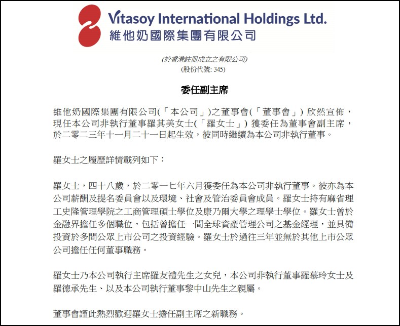 11月21日,維他奶國際集團有限公司發(fā)布副主席委任公告。 公告顯示,維他奶國際現(xiàn)任非執(zhí)行董事羅其美獲委任為董事會副主席,于2023年11月21日生效,同時繼續(xù)任公司非執(zhí)行董事。 從公告獲悉,羅其美,于2017年6月獲委任為該公司非執(zhí)行董事。彼亦為該公司薪酬及提名委員會以及環(huán)境、社會及管治委員會成員。其持有麻省理工史隆管理學(xué)院之工商管理碩士學(xué)位及康乃爾大學(xué)的理學(xué)士學(xué)位。 羅其美曾于金融界擔(dān)任多個職位,包括曾擔(dān)任一間全球資產(chǎn)管理公司的基金經(jīng)理,并具備投資于多間公眾上市公司的投資經(jīng)驗。其于過往三年并無于其他上市公眾公司擔(dān)任任何董事職務(wù)。 公告還披露,羅其美乃維他奶國際執(zhí)行主席羅友禮先生的女兒,該公司非執(zhí)行董事羅慕玲女士及羅德承先生、以及公司執(zhí)行董事黎中山先生的親屬。 |