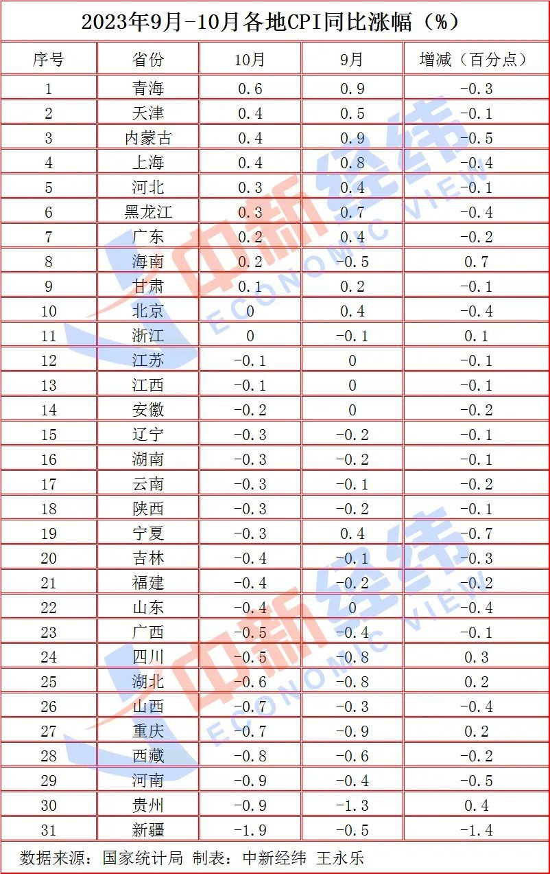 近日,國家統(tǒng)計(jì)局公布了31省份2023年10月居民消費(fèi)價格指數(shù)(CPI)。 數(shù)據(jù)顯示,2023年10月,全國CPI環(huán)比下降0.1%,同比下降0.2%,同比時隔兩個月后再度出現(xiàn)負(fù)增長。 具體來看,31省份10月CPI同比延續(xù)“跌多漲少”格局。其中,9省份同比上漲,20省份同比下降,2個省份持平,漲、跌省份較上月分別減少1個和增加3個。 青海、天津、內(nèi)蒙古、上海、河北、黑龍江、廣東、海南、甘肅等9省份同比上漲,北京、浙江持平,江蘇、江西、安徽、遼寧、湖南、云南、陜西、寧夏、吉林、福建、山東、廣西、四川、湖北、山西、重慶、西藏、河南、貴州、新疆等20省份同比下降,其中,貴州、河南、山西等3省份物價連續(xù)七個月回落,新疆是唯一降超1%的省份。 另外,從增減幅來看,海南增幅最大,為0.7個百分點(diǎn);新疆降幅最大,為1.4個百分點(diǎn)。 |