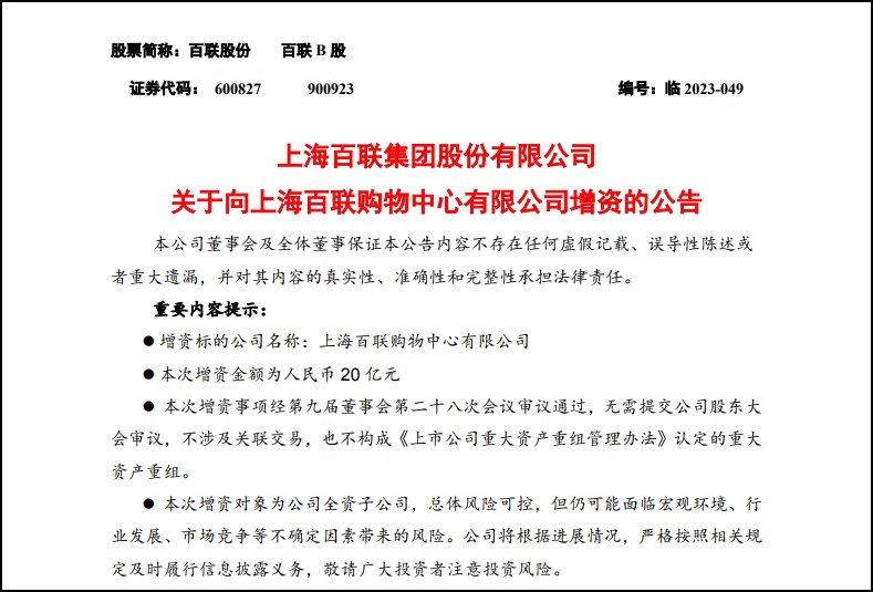 11月24日,百聯股份發(fā)布公告稱,根據公司戰(zhàn)略發(fā)展目標及業(yè)務需要,擬將下屬全資子公司上海百聯購物中心有限公司作為公司二級平臺投資公司,故擬對百購增資20億元。 本次對百購增資是根據該公司戰(zhàn)略發(fā)展將其作為公司下屬二級平臺投資公司。 據百聯股份10月31日披露的2023年三季報顯示。2023年前三季度,公司實現營業(yè)總收入235.59億元,同比下降6.16%;歸母凈利潤3.44億元,同比扭虧;扣非凈利潤2.77億元,同比扭虧。 |