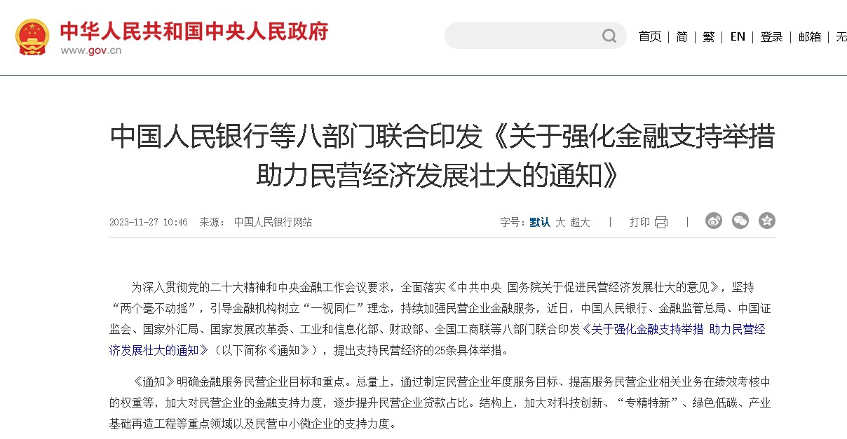 近日,中國(guó)人民銀行、金融監(jiān)管總局、中國(guó)證監(jiān)會(huì)、國(guó)家外匯局、國(guó)家發(fā)展改革委、工業(yè)和信息化部、財(cái)政部、全國(guó)工商聯(lián)等八部門(mén)聯(lián)合印發(fā)《關(guān)于強(qiáng)化金融支持舉措 助力民營(yíng)經(jīng)濟(jì)發(fā)展壯大的通知》,提出支持民營(yíng)經(jīng)濟(jì)的25條具體舉措。 一、持續(xù)加大信貸資源投入,助力民營(yíng)經(jīng)濟(jì)發(fā)展壯大 (一)明確金融服務(wù)民營(yíng)企業(yè)目標(biāo)和重點(diǎn)。銀行業(yè)金融機(jī)構(gòu)要制定民營(yíng)企業(yè)年度服務(wù)目標(biāo),提高服務(wù)民營(yíng)企業(yè)相關(guān)業(yè)務(wù)在績(jī)效考核中的權(quán)重,加大對(duì)民營(yíng)企業(yè)的金融支持力度,逐步提升民營(yíng)企業(yè)貸款占比。健全適應(yīng)民營(yíng)企業(yè)融資需求特點(diǎn)的組織架構(gòu)和產(chǎn)品服務(wù),加大對(duì)科技創(chuàng)新、“專(zhuān)精特新”、綠色低碳、產(chǎn)業(yè)基礎(chǔ)再造工程等重點(diǎn)領(lǐng)域民營(yíng)企業(yè)的支持力度,支持民營(yíng)企業(yè)技術(shù)改造投資和項(xiàng)目建設(shè),積極滿(mǎn)足民營(yíng)中小微企業(yè)的合理金融需求,優(yōu)化信貸結(jié)構(gòu)。合理提高民營(yíng)企業(yè)不良貸款容忍度,建立健全民營(yíng)企業(yè)貸款盡職免責(zé)機(jī)制,充分保護(hù)基層展業(yè)人員的積極性。 (二)加大首貸、信用貸支持力度。銀行業(yè)金融機(jī)構(gòu)要積極開(kāi)展首貸客戶(hù)培育拓展行動(dòng),加強(qiáng)與發(fā)展改革和行業(yè)管理部門(mén)、工商聯(lián)、商會(huì)協(xié)會(huì)對(duì)接合作,挖掘有市場(chǎng)、有效益、信用好、有融資需求的優(yōu)質(zhì)民營(yíng)企業(yè),制定針對(duì)性綜合培育方案,提升民營(yíng)企業(yè)的金融獲得率。強(qiáng)化科技賦能,開(kāi)發(fā)適合民營(yíng)企業(yè)的信用類(lèi)融資產(chǎn)品,推廣“信易貸”模式,發(fā)揮國(guó)家產(chǎn)融合作平臺(tái)作用,持續(xù)擴(kuò)大信用貸款規(guī)模。 (三)積極開(kāi)展產(chǎn)業(yè)鏈供應(yīng)鏈金融服務(wù)。銀行業(yè)金融機(jī)構(gòu)要積極探索供應(yīng)鏈脫核模式,支持供應(yīng)鏈上民營(yíng)中小微企業(yè)開(kāi)展訂單貸款、倉(cāng)單質(zhì)押貸款等業(yè)務(wù)。進(jìn)一步完善中征應(yīng)收賬款融資服務(wù)平臺(tái)功能,加強(qiáng)服務(wù)平臺(tái)應(yīng)用。促進(jìn)供應(yīng)鏈票據(jù)規(guī)范發(fā)展。深入實(shí)施“一鏈一策一批”中小微企業(yè)融資促進(jìn)行動(dòng),支持重點(diǎn)產(chǎn)業(yè)鏈和先進(jìn)制造業(yè)集群、中小企業(yè)特色產(chǎn)業(yè)集群內(nèi)民營(yíng)中小微企業(yè)融資。 (四)主動(dòng)做好資金接續(xù)服務(wù)。鼓勵(lì)主辦銀行和銀團(tuán)貸款牽頭銀行積極發(fā)揮牽頭協(xié)調(diào)作用,對(duì)暫時(shí)遇到困難但產(chǎn)品有市場(chǎng)、項(xiàng)目有發(fā)展前景、技術(shù)有市場(chǎng)競(jìng)爭(zhēng)力的民營(yíng)企業(yè),按市場(chǎng)化原則提前對(duì)接接續(xù)融資需求,不盲目停貸、壓貸、抽貸、斷貸。抓好《關(guān)于做好當(dāng)前金融支持房地產(chǎn)市場(chǎng)平穩(wěn)健康發(fā)展工作的通知》(銀發(fā)〔2022〕254號(hào)文)等政策落實(shí)落地,保持信貸、債券等重點(diǎn)融資渠道穩(wěn)定,合理滿(mǎn)足民營(yíng)房地產(chǎn)企業(yè)金融需求。 (五)切實(shí)抓好促發(fā)展和防風(fēng)險(xiǎn)。銀行業(yè)金融機(jī)構(gòu)要增強(qiáng)服務(wù)民營(yíng)企業(yè)的可持續(xù)性,依法合規(guī)審慎經(jīng)營(yíng)。健全信用風(fēng)險(xiǎn)管控機(jī)制,加強(qiáng)享受優(yōu)惠政策低成本資金使用管理,嚴(yán)格監(jiān)控資金流向。加強(qiáng)關(guān)聯(lián)交易管理,提高對(duì)關(guān)聯(lián)交易的穿透識(shí)別、監(jiān)測(cè)預(yù)警能力。 二、深化債券市場(chǎng)體系建設(shè),暢通民營(yíng)企業(yè)債券融資渠道 (六)擴(kuò)大民營(yíng)企業(yè)債券融資規(guī)模。支持民營(yíng)企業(yè)注冊(cè)發(fā)行科創(chuàng)票據(jù)、科創(chuàng)債券、股債結(jié)合類(lèi)產(chǎn)品、綠色債券、碳中和債券、轉(zhuǎn)型債券等,進(jìn)一步滿(mǎn)足科技創(chuàng)新、綠色低碳等領(lǐng)域民營(yíng)企業(yè)資金需求。支持民營(yíng)企業(yè)發(fā)行資產(chǎn)支持證券,推動(dòng)盤(pán)活存量資產(chǎn)。優(yōu)化民營(yíng)企業(yè)債務(wù)融資工具注冊(cè)機(jī)制,注冊(cè)全流程采用“快速通道”,支持儲(chǔ)架式注冊(cè)發(fā)行,提高融資服務(wù)便利度。 (七)充分發(fā)揮民營(yíng)企業(yè)債券融資支持工具作用。鼓勵(lì)中債信用增進(jìn)投資股份有限公司、中國(guó)證券金融股份有限公司以及市場(chǎng)機(jī)構(gòu)按照市場(chǎng)化、法治化原則,通過(guò)擔(dān)保增信、創(chuàng)設(shè)信用風(fēng)險(xiǎn)緩釋工具、直接投資等方式,推動(dòng)民營(yíng)企業(yè)債券融資支持工具擴(kuò)容增量、穩(wěn)定存量。 (八)加大對(duì)民營(yíng)企業(yè)債券投資力度。鼓勵(lì)和引導(dǎo)商業(yè)銀行、保險(xiǎn)公司、各類(lèi)養(yǎng)老金、公募基金等機(jī)構(gòu)投資者積極科學(xué