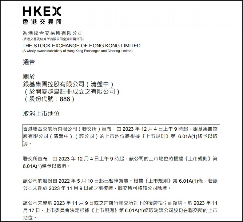 11月29日,高檔酒類營運商銀基集團控股有限公司(簡稱“銀基集團”)發(fā)布公告稱,香港聯(lián)合交易所有限公司(簡稱“聯(lián)交所”)宣布,12月4日上午9時起,銀基集團的上市地位將取消。 公告顯示,銀基集團的股份自2022年5月10日起已暫停買賣,根據(jù)相關(guān)規(guī)定,銀基集團若未能于2023年11月9日或之前復(fù)牌,聯(lián)交所可將該公司除牌,但銀基集團未能按期履行聯(lián)交所的復(fù)牌指引而復(fù)牌。 作為一家以高檔酒類運營為特色的企業(yè),銀基集團近幾年業(yè)績表現(xiàn)欠佳。根據(jù)銀基集團發(fā)布的2021年中期報告,截至2021年9月30日止的六個月,其收益約為1.005億港元,較上年同期減少約85.1%;公司普通權(quán)益持有人應(yīng)占虧損約1.875億港元,同比止盈轉(zhuǎn)虧。 而隨后的2022年年度報告,銀基集團連續(xù)發(fā)布延遲公告。到2023年11月16日,銀基集團確定被取消在聯(lián)交所的上市地位,銀基集團表示,不會就此除牌決定申請復(fù)核。 |