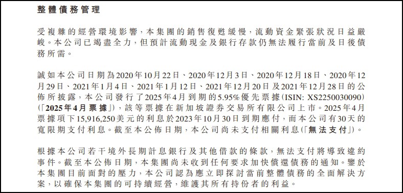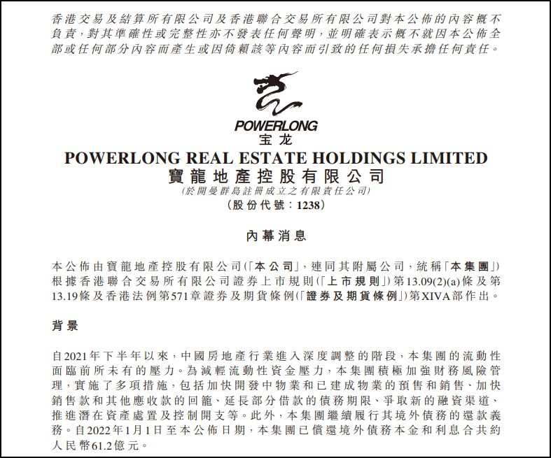 本文來源 / 地產(chǎn)資管界 11月29日,寶龍地產(chǎn)控股有限公司公布,2025年4月到期的5.95%優(yōu)先票據(jù)項(xiàng)下15,916,250美元利息于10月30日到期應(yīng)付,有30天的寬限期,截至本公布日期,公司尚未支付相關(guān)利息。 公告披露,根據(jù)公司若干境外長(zhǎng)期計(jì)息銀行及其他借款的條款,無法支付將導(dǎo)致違約事件。鑒于集團(tuán)目前面對(duì)的壓力,公司認(rèn)為應(yīng)立即探討當(dāng)前整體債務(wù)的全面解決方案。 公告發(fā)布后,今日寶龍地產(chǎn)發(fā)行的美元債跌幅最大的PWRLNG 5.95 04/30/25下跌了18.036%,現(xiàn)價(jià)基本在7美元左右,收益率最高的達(dá)到了353.87%。 截至10月31日止十個(gè)月,寶龍地產(chǎn)合約銷售總額(連同共同控制實(shí)體及聯(lián)營(yíng)公司的合約銷售額)及合約銷售總面積分別約為252.83億元及168.14萬平方米。 寶龍地產(chǎn)表示,截至本公布日期,集團(tuán)仍繼續(xù)保持正常的業(yè)務(wù)營(yíng)運(yùn)。 資料顯示,寶龍集團(tuán),于1990年創(chuàng)辦了澳門,目前已形成地產(chǎn)、商業(yè)、酒店、文化藝術(shù)等多元產(chǎn)業(yè)格局,旗下“寶龍地產(chǎn)”,于2009年在香港主板成功上市。 寶龍集團(tuán)及寶龍地產(chǎn),LOGO是一條龍,在澳門,許健康有“澳門龍”之稱;原因有二:一是許健康原名叫許金龍,生肖屬龍,自小就爭(zhēng)強(qiáng)好勝;二是企業(yè)名稱,叫澳門寶龍集團(tuán),也是企盼生意興旺、龍騰九霄之意。許健康創(chuàng)業(yè)的第一家公司,是1982年創(chuàng)辦的,名叫“澳門金龍貿(mào)易公司”,其實(shí),這個(gè)企業(yè)名稱,也就是用他原名起的。 事實(shí)上,寶龍地產(chǎn)一直被外界質(zhì)疑家族化色彩濃厚。 據(jù)寶龍地產(chǎn)官網(wǎng)資料顯示,公司執(zhí)行董事包括許健康、許華芳、肖清平、施思妮、張洪峰。其中,許華芳為許健康之子,施思妮為許華芳之妻。此外,寶龍地產(chǎn)非執(zhí)行董事許華芬為許健康之女。 據(jù)相關(guān)媒體報(bào)道,寶龍地產(chǎn)先后有多名職業(yè)經(jīng)理人離職,這與“地產(chǎn)二代”許華芳事無巨細(xì)地管理集團(tuán)大小事務(wù)不無關(guān)系。寶龍地產(chǎn)的地產(chǎn)主業(yè)下設(shè)事業(yè)一部、事業(yè)二部、置地、浙江事業(yè)部四個(gè)平臺(tái),各有副總裁負(fù)責(zé),他們?nèi)枷蛟S華芳匯報(bào),許華芳還兼任商管負(fù)責(zé)人。 |