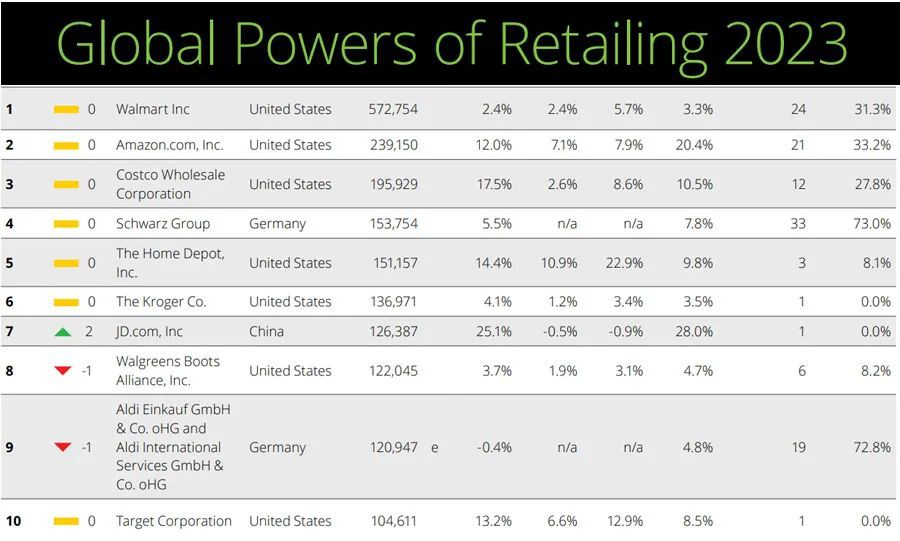 德勤(Deloitte)發(fā)布《2023全球零售力量》報告(Global Powers of Retailing 2023)。該報告基于截至2022年6月30日的2021財政年度公開數(shù)據(jù)進行排名,統(tǒng)計出全球250強零售榜單(Global Powers of Retailing Top 250)。沃爾瑪仍然位居第一,京東升至第七位。 250家零售企業(yè)按區(qū)域分布,歐洲有90家,北美有79家,亞太有60家,拉美有11家,中東和非洲有10家。按國家和地區(qū),美國71家上榜,日本27家,英國19家,德國17家,法國12家,加拿大8家,韓國6家,澳大利亞、西班牙、俄羅斯、墨西哥、南非各5家,荷蘭、巴西各4家,土耳其、阿聯(lián)酋、智利各2家,以色列1家。中國(含大陸、香港、臺灣)共有15家零售企業(yè)上榜,其中7家進入前100強。 全球零售250強2021財年共計收入5.65萬億美元,比上財年增長8%。其中前十大零售商營收之和為1.92萬億美元,占總營收的34%。全球零售250強的收入門坎為44.78億美元。250大零售商中,136家主要銷售快速消費品,57家主要銷售硬件和休閑產(chǎn)品,38家主要銷售服裝和飾品,19家銷售多樣化。 全球前100大零售商 排名 公司 創(chuàng)始國 財年零售營收/總營收 零售類別 開店國家地區(qū)數(shù) 1、沃爾瑪(Walmart Inc) 美國 5727.54億美元/5727.54億美元 大賣場/大型購物中心 24 2、亞馬遜(Amazon.com, Inc.) 美國 2391.50億美元/4698.22億美元 無店鋪 21 3、開市客(Costco Wholesale Corporation) 美國 1959.29億美元/1959.29億美元 現(xiàn)購自運/倉儲會員店 12 4、施瓦茨集團(Schwarz Group) 德國 1537.54億美元/1562.09億美元 折扣商店 33 5、家得寶(The Home Depot, Inc.) 美國 1511.57億美元/1511.57億美元 家庭裝修 3 6、克羅格(The Kroger Co.) 美國 1369.71億美元/1378.88億美元 超市 1 7、京東(JD.com, Inc) 中國 1263.87億美元/1474.50億美元 無店鋪 1 8、沃博聯(lián)(Walgreens Boots Alliance, Inc.) 美國 1220.45億美元/1325.09億美元 藥店/藥房 6 9、奧樂齊(Aldi Einkauf GmbH & Co. oHG and Aldi International Services GmbH & Co. oHG) 德國 1209.47億美元/ 1209.47億美元 折扣商店 19 10、塔吉特(Target Corporation) 美國 1046.11億美元/1060.05億美元 折扣百貨商店 1 11、CVS健康(CVS Health Corporation) 美國 1001.05億美元/2921.11億美元 藥店/藥房 1 12、勞氏(Lowe's Companies, Inc. ) 美國 962.50億美元/962.50億美元 家庭裝修 2 13、阿霍德德爾海茲(Ahold Delhaize) 荷蘭 893.81億美元/893.81億美元 超市 10 14、Tesco PLC 英國 828.81億美元/841.45億美元 大賣場/大型購物中心 5 15、柒和伊控股(Seven & i Holdings Co., Ltd.) 日本 769.12億美元/784.58億美元 便利店 18 16、艾德卡(Edeka-Verbund) 德國 724.62億美元/741.29億美元 超市 1 17、永旺(Aeon Co., Ltd.) 日本 721.90億美元/781.55億美元 大賣場/大型購物中心 11 18、艾柏森(Albertsons Companies, Inc.) 美國 718.87億美元/718.87億美元 超市 1 19、Rewe Group 德國 627.35億美元/819.98億美元 超市 10 20、路威酩軒(LVMH Moet Hennessy-Louis Vuitton S.A.) 法國 563.05億美元/759.20億美元 其他專營 80 21、Centres Distributeurs E. Leclerc 法國 543.85億美元/600.60億美元 超市 6 22、百思買(Best Buy Co., Inc.) 美國 517.61億美元/517.61億美元 電子產(chǎn)品專營 2 23、The TJX Companies, Inc. 美國 485.50億美元/485.50億美元 服飾鞋類專營 9 24、Publix Super Markets, Inc. 美國 483.94億美元/483.94億美元 超市 1 25、宜家集團/英格卡控股(The IKEA Group/INGKA Holding B.V.) 荷蘭 446.99億美元/475.49億美元 其他專營 32 26、ITM Developpement International 法國 436.26億美元/597.55億美元 超市 27、Loblaw Companies Limited 加拿大 416.83億美元/424.02億美元 大賣場/大型購物中心 1 28、伍爾沃斯(Woolworths Limited) 澳大利亞 413.20億美元/441.22億美元 超市 2 29、阿里巴巴新零售(Alibaba Group Holding Limited/ New Retail& Direct Sales) 中國 406.45億美元/1328.69億美元 大賣場/大型購物中心 1 30、英佰瑞(J Sainsbury plc) 英國 404.14億美元/410.07億美元 大賣場/大型購物中心 2 31、Casino Guichard-Perrachon S.A. 法國 361.17億美元/367.13億美元 大賣場/大型購物中心 27 32、ELO SA (原歐尚控股Auchan Holding SA) 法國 361.11億美元/367.55億美元 大賣場/大型購物中心 12 33、達樂(Dollar General Corporation) 美國 342.20億美元/342.20億美元 折扣商店 1 34、H-E-B Grocery Company LP (原H.E. Butt Grocery Company) 美國330.00億美元/330.00億美元 超市 1 35、Inditex, S.A. 西班牙 325.67億美元/325.67億美元 服飾鞋類專營 215 36、Asda Group Limited 英國 322.97億美元/322.97億美元 大賣場/大型購物中心 1 37、Mercadona, S.A. 西班牙 301.68億美元/301.68億美元 超市 2 38、Groupe Adeo SA 法國 300.35億美元/310.77億美元 家庭裝修 13 39、X5 Retail Group N.V. 俄羅斯 298.31億美元/299.06億美元 折扣商店 1 40、客澳市(Coles Group Limited) 澳大利亞 285.47億美元/288.20億美元 超市 1 41、Migros-Genossenschafts Bund 瑞士 283.22億美元/316.43億美元 大賣場/大型購物中心 3 42、Systeme U, Centrale Nationale 法國 279.49億美元/338.13億美元 超市 7 43、Coop Group 瑞士 275.59億美元/348.58億美元 超市 8 44、美元樹(Dollar Tree, Inc.) 美國 263.21億美元/263.21億美元 折扣商店 2 45、Ceconomy AG 德國 255.27億美元/255.27億美元 電子產(chǎn)品專營 13 46、威廉莫里森(Wm Morrison Supermarkets PLC) 英國 247.93億美元/247.93億美元 超市 1 47、Jeronimo Martins, SGPS, S.A. 葡萄牙 246.97億美元/246.97億美元 折扣商店 3 48、麥德龍(Metro Ag) 德國 246.20億美元/295.95億美元 現(xiàn)購自運/倉儲會員店 24 49、PJSC "Magnit" 俄羅斯 245.20億美元/251.76億美元 便利店 1 50、梅西(Macy's, Inc.) 美國 244.60