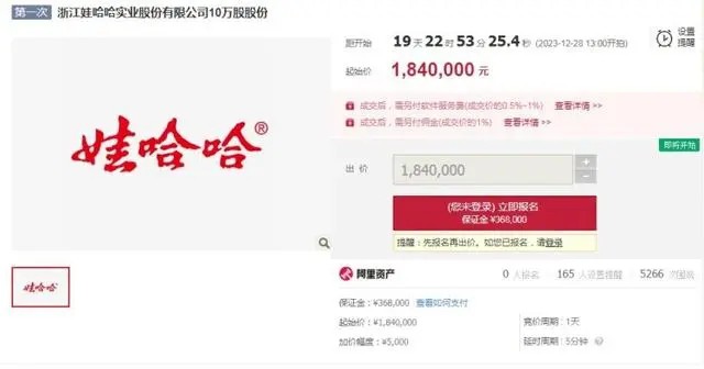 12月8日,據(jù)阿里資產(chǎn)拍賣網(wǎng),浙江省飼料有限公司將于12月28日13時進(jìn)行競價轉(zhuǎn)讓其持有的浙江娃哈哈實業(yè)股份有限公司10萬股股份,起拍價格184萬元,折合每股18.4元。目前已經(jīng)吸引超過5000次圍觀。 據(jù)顯示,標(biāo)的物為浙江娃哈哈實業(yè)股份有限公司10萬股股份,競價起始價為184萬元,保證金36.8萬元,每次增價幅度為5000元。 浙江娃哈哈實業(yè)股份有限公司成立于1993年,注冊資本9179.1755萬元人民幣,法定代表人宗慶后,經(jīng)營范圍包括初級食用農(nóng)產(chǎn)品、水產(chǎn)品、百貨、針紡織品、服裝、皮革制品、五金交電、工藝美術(shù)品等。 |