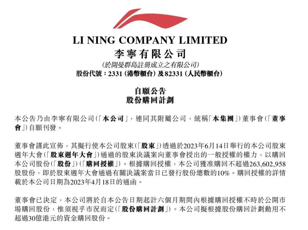 本文來源 / 南方都市報 李寧又有新動作。12月12日,李寧(02331.HK)發(fā)布公告稱,經(jīng)董事會決定,公司將于自今日起計六個月期間,根據(jù)購回授權(quán)不時于公開市場購回股份,該計劃須視乎市況而定。 根據(jù)股份購回計劃,李寧擬動用不超過30億港元的資金回購不超過2.64億公司股份,即于股東周年大會通過有關(guān)決議案當(dāng)日(6月14日),已發(fā)行股份總數(shù)的10%。 公告稱,董事會對李寧的業(yè)務(wù)前景及長遠(yuǎn)增長充滿信心,其認(rèn)為公司的現(xiàn)行股價低于其內(nèi)在實際價值。公司現(xiàn)有的財務(wù)資源可讓其實施股份購回計劃,且根據(jù)該計劃購回股份將不會對本集團(tuán)的業(yè)務(wù)營運(yùn)或現(xiàn)金流量狀況造成不利影響。此外,股份購回計劃將增加每股股份盈利。 受此消息影響,李寧股價未延續(xù)11日大幅下跌,而出現(xiàn)小幅上漲。截至12日14時30分,李寧股價上漲5.03%,報19.22港元/股。 據(jù)南都灣財社此前報道,11日李寧因在香港大手筆置產(chǎn)的舉動引發(fā)關(guān)注。據(jù)公告披露,李寧擬以22.08億港元從恒基兆業(yè)(00012.HK)購入一棟商業(yè)建筑,部分將用作李寧的香港總部。 然而,市場卻并不看好李寧這一動作。截至11日收盤,李寧報收18.3港元/股,跌幅達(dá)14.29%,刷新2020年3月以來股價新低,市值縮水至480億港元。年內(nèi)累計跌超70%,為今年恒生指數(shù)中表現(xiàn)最差成分股。 對此,11日晚間,李寧方面回應(yīng)南都·灣財社記者稱,公司的國際化戰(zhàn)略布局正處于積極發(fā)展階段。李寧在香港設(shè)立總部的決策,是公司國際化進(jìn)程中的一個重要里程碑!皬2022年香港門店開業(yè)以來,海外拓展已提上集團(tuán)業(yè)務(wù)規(guī)劃之中,我們預(yù)計2024年會啟動李寧海外業(yè)務(wù)的拓展”。 |