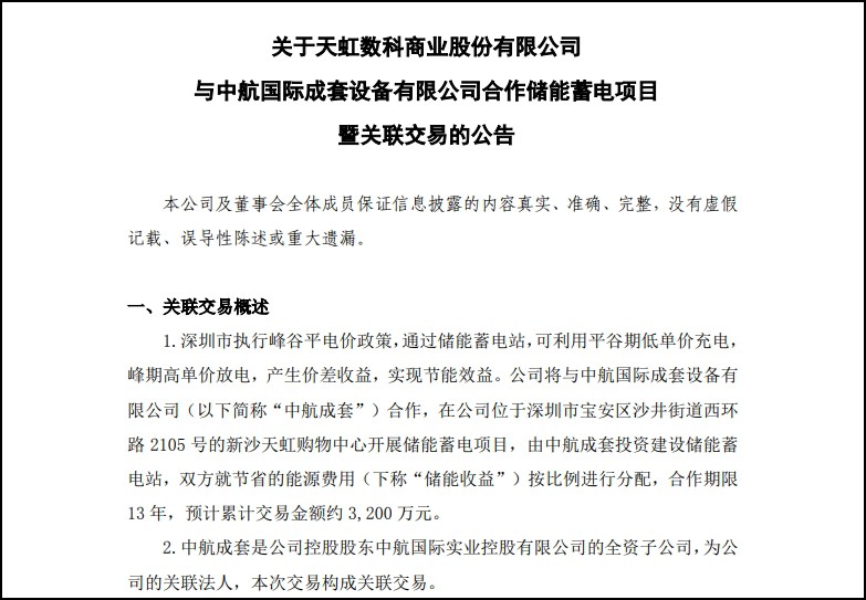 12月13日,天虹數(shù)科商業(yè)股份有限公司發(fā)布公告,與中航國際成套設(shè)備有限公司合作儲能蓄電項目。 據(jù)了解,深圳市執(zhí)行峰谷平電價政策,通過儲能蓄電站,可利用平谷期低單價充電,峰期高單價放電,產(chǎn)生價差收益,實現(xiàn)節(jié)能效益。 天虹股份將與中航國際成套設(shè)備有限公司(簡稱“中航成套”)合作,在天虹股份位于深圳市寶安區(qū)沙井街道西環(huán)路2105號的新沙天虹購物中心開展儲能蓄電項目,由中航成套投資建設(shè)儲能蓄電站,雙方就節(jié)省的能源費用按比例進(jìn)行分配,合作期限13年,預(yù)計累計交易金額約3200萬元。 中航成套是天虹股份控股股東中航國際實業(yè)控股有限公司的全資子公司,2023年1-10月,天虹股份與中航成套合計已發(fā)生的各類關(guān)聯(lián)交易的總金額約107.45萬元。 |