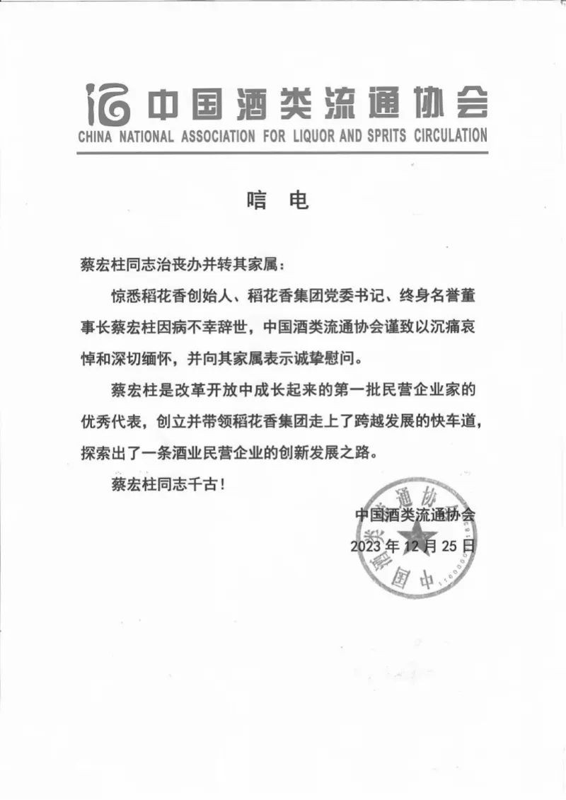 來(lái)源 / 南方都市報(bào) 12月25日,據(jù)多家媒體報(bào)道,湖北知名酒企稻花香創(chuàng)始人蔡宏柱于12月24日病逝,享年72歲。目前,稻花香集團(tuán)官網(wǎng)已變?yōu)楹诎。中?guó)酒類流通協(xié)會(huì)、湖北省酒類流通協(xié)會(huì)均已發(fā)布唁電。 資料顯示,蔡宏柱出生于1951年10月,是湖北宜昌知名企業(yè)家,也是稻花香創(chuàng)始人、稻花香集團(tuán)黨委書記、終身名譽(yù)董事長(zhǎng)、高級(jí)工程師、高級(jí)經(jīng)濟(jì)師。在他的帶領(lǐng)下,稻花香從零開(kāi)始,目前年?duì)I業(yè)收入已超600億元。 稻花香集團(tuán)官網(wǎng)顯示,公司起步于1982年,1992年創(chuàng)立“稻花香”品牌,1997年實(shí)現(xiàn)集團(tuán)化經(jīng)營(yíng),歷經(jīng)40余年不懈奮斗,企業(yè)規(guī)模不斷壯大、品牌形象不斷提升、綜合實(shí)力不斷增強(qiáng)。目前,已發(fā)展成以白酒為主業(yè),以物流、配套、文化旅游為輔的“一主三輔”產(chǎn)業(yè)集群的大型企業(yè)集團(tuán)。集團(tuán)旗下“稻花香”“關(guān)公坊”“清樣”“君之紅”等先后被國(guó)家工商總局認(rèn)定為“中國(guó)馳名商標(biāo)”。 在近期發(fā)布的“2023中國(guó)民營(yíng)企業(yè)500強(qiáng)”榜單中,稻花香集團(tuán)憑借605.2128億元營(yíng)業(yè)收入,在全國(guó)排名第180位,高居湖北省第4強(qiáng),也是湖北宜昌唯一上榜的民營(yíng)企業(yè)。 湖北省酒類流通協(xié)會(huì)25日發(fā)表唁電稱,蔡宏柱一生為湖北乃至中國(guó)的酒類行業(yè)發(fā)展做出了重要貢獻(xiàn),創(chuàng)建和引領(lǐng)了稻花香酒業(yè)品牌及企業(yè),為楚酒在全國(guó)的地位提升做出了積極的貢獻(xiàn)。 中國(guó)酒類流通協(xié)會(huì)在唁電中則表示,蔡宏柱是改革開(kāi)放中成長(zhǎng)起來(lái)的第一批民營(yíng)企業(yè)家的優(yōu)秀代表,創(chuàng)立并帶領(lǐng)稻花香集團(tuán)走上了跨越發(fā)展的快車道,探索出了一條酒業(yè)民營(yíng)企業(yè)的創(chuàng)新發(fā)展之路。 白酒行業(yè)分析師肖竹青表示,稻花香上下游產(chǎn)業(yè)鏈帶動(dòng)了很多關(guān)聯(lián)企業(yè)發(fā)展并且直接和間接解決了大量就業(yè),稻花香釀酒、采購(gòu)釀酒原料直接促進(jìn)了農(nóng)民增收,在發(fā)展過(guò)程中為湖北公益慈善事業(yè)做出了很多貢獻(xiàn)。 據(jù)了解,2018年1月, 蔡宏柱卸任稻花香集團(tuán)董事長(zhǎng),由其子蔡開(kāi)云接任集團(tuán)董事長(zhǎng)一職。對(duì)此,肖竹青認(rèn)為蔡宏柱的去世對(duì)稻花香公司發(fā)展未來(lái)影響不大,因?yàn)榈净ㄏ愣崎T人蔡開(kāi)云就職稻花香董事長(zhǎng)多年,已經(jīng)完全掌握了稻花香公司人財(cái)物產(chǎn)供銷體系。 |