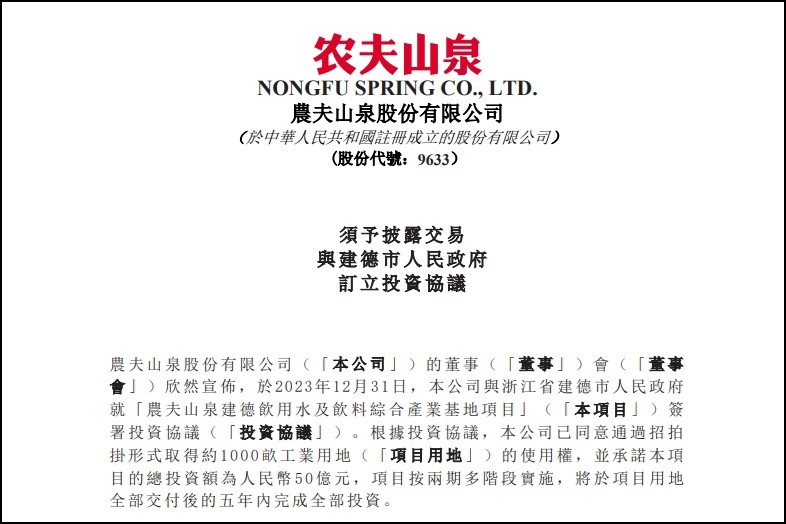本文來源 / 小食代 1月1日(今天),農(nóng)夫山泉股份有限公司(以下簡稱“農(nóng)夫山泉”)宣布,已于2023年12月31日與浙江省建德市人民政府就“農(nóng)夫山泉建德飲用水及飲料綜合產(chǎn)業(yè)基地項目”簽訂投資協(xié)議。 根據(jù)協(xié)議內(nèi)容,農(nóng)夫山泉計劃在浙江省建德市通過招拍掛形式取得約1000畝工業(yè)用地的使用權(quán),并承諾對該項目的總投資額將達到人民幣50億元。資金來源為公司自有資金。 在用地規(guī)劃方面,這個項目的總用地面積約66.67萬平方米,位于浙江省建德市城南新區(qū),其中一期約700畝,二期約300畝,該公司將依法獲得完整的國有土地使用權(quán)。 據(jù)介紹,投資項目將分兩期多階段實施,涵蓋飲用水、飲料及其相關(guān)產(chǎn)品的生產(chǎn)加工制造領(lǐng)域,致力于打造一個集中的飲用水及飲料綜合產(chǎn)業(yè)基地。 根據(jù)公告,農(nóng)夫山泉之所以進行這個投資,是旨在依托千島湖優(yōu)質(zhì)的天然水資源,進一步擴大產(chǎn)能,提升產(chǎn)品和服務(wù)供給能力,增強集團整體競爭力和投資回報,穩(wěn)固行業(yè)內(nèi)領(lǐng)先地位。 如果一切順利,農(nóng)夫山泉預(yù)計,自2024年6月起,在未來五年內(nèi)完成全部投資;如果因市場行情發(fā)生重大變化,投資完成期限可延長兩年。 據(jù)介紹,建德市方面的主要權(quán)利和義務(wù)包括提供無權(quán)屬爭議的土地資源,確保約1000畝工業(yè)用地以招拍掛形式出讓,使用年限為50年,并承諾于2024年底前分階段完成供地,同時實現(xiàn)“六通一平”等配套設(shè)施建設(shè);農(nóng)夫山泉方面則承諾,在首批300畝項目用地交付后的6個月內(nèi)動工建設(shè),并在開工后18個月內(nèi)至少完成4條生產(chǎn)線的投產(chǎn),按照約定時間完成全部投資。 對此,農(nóng)夫山泉董事會認為,該投資協(xié)議基于正常商業(yè)條款訂立,其條款公平合理,符合公司及股東的整體利益。 值得注意的是,這也是農(nóng)夫山泉上市以來,金額大得首次要以公告形式披露的有關(guān)擴大產(chǎn)能的投資:根據(jù)上市規(guī)則計算的投資金額適用百分比超過5%但低于25%,該交易構(gòu)成須予披露交易。 這筆最新披露的投資也似乎有農(nóng)夫山泉在新一年重拾“初心”的意味:資料顯示,1996年,農(nóng)夫山泉第一個工廠就在建德。從浙江千島湖出發(fā),這家“大自然的搬運工”走向了全國。將于項目用地全部交付后的五年內(nèi)完成全部投資。 |