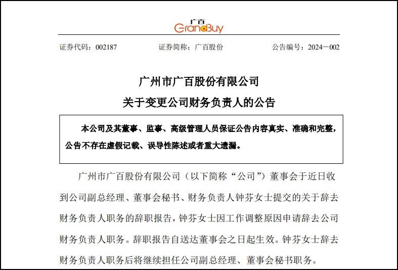 1月3日消息,廣百股份有限公司1月2日發(fā)布公告稱,公司副總經(jīng)理、董事會秘書及財務負責人鐘芬女士因工作調(diào)整原因,已辭去財務負責人職務,但將繼續(xù)擔任公司副總經(jīng)理及董事會秘書。 1月1日,公司第七屆董事會第十一次會議審議通過了關(guān)于聘任蘇兆忠先生為公司副總經(jīng)理及財務負責人的議案。蘇兆忠曾任廣州友誼集團有限公司財務部部長、廣州商貿(mào)投資控股集團有限公司財務會計部副總監(jiān)等職務,現(xiàn)任本公司副總經(jīng)理及財務負責人。 據(jù)公告,蘇兆忠未持有公司股份,且與持有公司5%以上股份的股東、實際控制人、公司其他董事、監(jiān)事、高級管理人員不存在關(guān)聯(lián)關(guān)系。公告還明確了蘇兆忠不存在《公司法》規(guī)定的不適合擔任上市公司高管的情形。 |