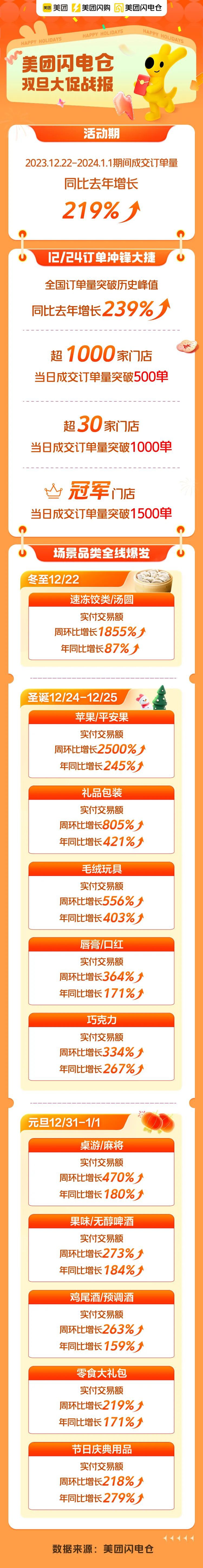 2023年雙旦大促落下帷幕,美團閃電倉商家們合力交出了一份亮眼成績單,活動期間(2023年12月22日-2024年1月1日)美團閃電倉成交訂單量同比去年增長219%,在12月24日訂單沖鋒日更是涌現(xiàn)出了1000多家單日成交訂單量突破500單的門店。 雙旦大促涵蓋冬至、圣誕和元旦三大需求場景,多場景下的重點品類在大促期間迎來了全面爆發(fā),比如冬至中的速凍餃類/湯圓、圣誕中的蘋果/禮品包裝/毛絨玩具、元旦中的桌游/麻將/無醇啤酒等。 |