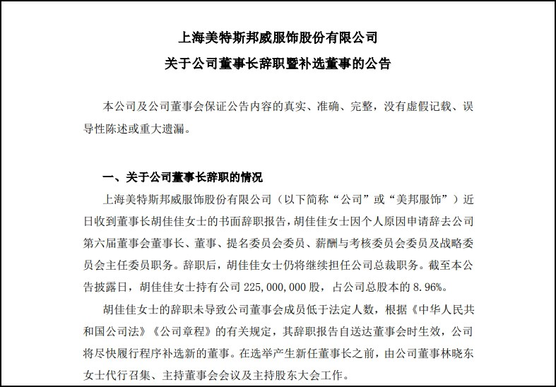 擔任美邦服飾董事長7年零1個月后,周成建之女胡佳佳向董事會遞交辭呈。 1月5日,美特斯邦威發(fā)布公告稱,近日收到董事長胡佳佳的書面辭呈報告,出于個人原因,胡佳佳申請辭去公司第六屆董事會董事長、董事、提名委員會委員、薪酬與考核委員會委員及戰(zhàn)略委員會主任委員職務,但辭職后仍將繼續(xù)擔任公司總裁。 截至披露日,胡佳佳持有公司2.25億股,占公司總股本的8.96%。目前,美特斯邦威未對胡佳佳辭職的原因作出進一步回應。 公告提出,胡佳佳的辭職報告自送達董事會時生效,美特斯邦威將盡快履行程序補選新的董事。在此之前,由董事林曉東代行召集、主持董事會會議及主持股東大會工作。此外,為滿足公司經(jīng)營管理需要,在董事會選舉出新任董事長并確定新任法定代表人前,仍由胡佳佳繼續(xù)履行法定代表人職責,直至公司完成新任法定代表人工商變更登記之日止。 公開資料顯示,胡佳佳為美特斯邦威創(chuàng)始人周成建之女,2010年畢業(yè)于阿斯頓大學市場營銷專業(yè),2011年取得倫敦馬蘭戈尼學院時尚營銷碩士學位。2011年以來,胡佳佳在美特斯邦威總裁辦公室、鞋類開發(fā)營運部、品牌營銷部、戰(zhàn)略發(fā)展部均有任職經(jīng)歷。 除辭職聲明外,本次公告還提出,美特斯邦威董事會于同日審議通過了《關于補選公司第六屆董事會非獨立董事的議案》,同意提名周成建為公司第六屆董事會非獨立董事候選人,任期自公司股東大會審議通過之日起至第六屆董事會任期屆滿之日止。 |
