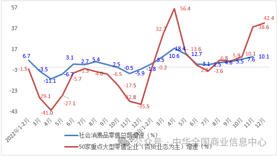 本文來(lái)源 / 中華全國(guó)商業(yè)信息中心 根據(jù)中華全國(guó)商業(yè)信息中心的監(jiān)測(cè)數(shù)據(jù),2023年全國(guó)50家重點(diǎn)大型零售企業(yè)(以百貨業(yè)態(tài)為主)零售額累計(jì)增長(zhǎng)15.6%。其中12月同比增長(zhǎng)42.4%(上年同期增速為-35.5%),增速相比11月加快了3.8個(gè)百分點(diǎn)。 分品類(lèi)來(lái)看,2023年除糧油食品類(lèi)零售額跟上年相比基本持平,增速為0.1%以外,其余品類(lèi)均實(shí)現(xiàn)明顯增長(zhǎng):其中服裝類(lèi)、家用電器類(lèi)、金銀珠寶類(lèi)零售額均實(shí)現(xiàn)兩位數(shù)增長(zhǎng),增速分別為21.3%、16.0%和14.4%;日用品類(lèi)、化妝品類(lèi)、文化辦公用品類(lèi)、體育娛樂(lè)用品類(lèi)分別累計(jì)增長(zhǎng)7.3%、7.2%、8.2%和5.3%。 12月份,糧油食品類(lèi)零售額同比增長(zhǎng)7.2%,其他多數(shù)品類(lèi)如服裝類(lèi)、化妝品類(lèi)、家用電器類(lèi)、金銀珠寶類(lèi)、體育娛樂(lè)用品類(lèi)等均實(shí)現(xiàn)超過(guò)2成的顯著增長(zhǎng)。 |