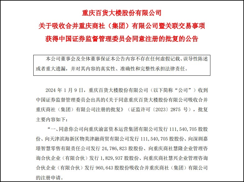 本文來源 / 觀點網(wǎng) 1月9日,重慶百貨大樓股份有限公司公告,已收到中國證券監(jiān)督管理委員會的批復(fù),同意其吸收合并重慶商社(集團)有限公司的注冊申請。 此次吸收合并將通過向特定對象發(fā)行股份的方式進行。 根據(jù)批復(fù),重慶百貨將向重慶渝富資本運營集團有限公司發(fā)行1.11億股股份、向天津濱海新區(qū)物美津融商貿(mào)有限公司發(fā)行1.11億股股份、向深圳嘉璟智慧零售有限責(zé)任公司發(fā)行2478.68萬股股份、向重慶商社慧隆企業(yè)管理咨詢合伙企業(yè)(有限合伙)發(fā)行182.99萬股股份、向重慶商社慧興企業(yè)管理咨詢合伙企業(yè)(有限合伙)發(fā)行96.06萬股股份,以完成吸收合并重慶商社的交易。 重慶百貨在公告中表示,將嚴格按照報送上海證券交易所的有關(guān)申請文件進行本次吸收合并,并及時履行信息披露義務(wù)。同時,公司也將根據(jù)相關(guān)法律法規(guī)的要求和公司股東大會的授權(quán),在規(guī)定期限內(nèi)辦理相關(guān)事宜。 |