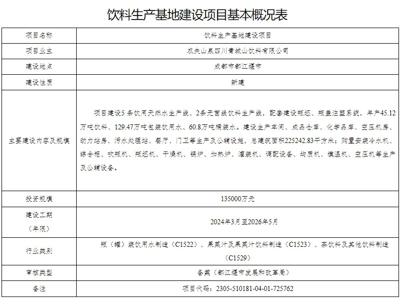 1月16日消息,四川省發(fā)展和改革委員會官網(wǎng)公布的信息顯示,農(nóng)夫山泉將在成都市都江堰新建飲料生產(chǎn)基地,投資規(guī)模為13.5億元。 根據(jù)上述官網(wǎng)信息,位于都江堰的農(nóng)夫山泉新基地建設(shè)工期為2024年3月至2026年5月,將建設(shè)5條飲用天然水生產(chǎn)線、2條無菌線飲料生產(chǎn)線,配套建設(shè)瓶坯、瓶蓋注塑系統(tǒng)。建成后,該基地將年產(chǎn)45.12萬噸飲料、129.47萬噸包裝飲用水、60.8萬噸桶裝水。 該基地所屬的行業(yè)類別包括“果菜汁及果菜汁飲料制造”、“茶飲料及其他飲料制造”。由此來看,這一基地將具備生產(chǎn)農(nóng)夫山泉兩大最核心品類水、即飲茶的能力。2023上半年,這兩個品類一同貢獻(xiàn)了近77%銷售額。 該項目之前簽約資料顯示,都江堰基地是繼峨眉山生產(chǎn)基地后,農(nóng)夫山泉在川投建的第二個生產(chǎn)基地。新基地將在5年內(nèi)全部建成投運(yùn),主要產(chǎn)品為天然飲用水及飲料等,建成后預(yù)計年產(chǎn)值達(dá)15億元以上。 在此之前,農(nóng)夫山泉才在2024年元旦假期公告了一項建德的50億元項目重大投資。 |