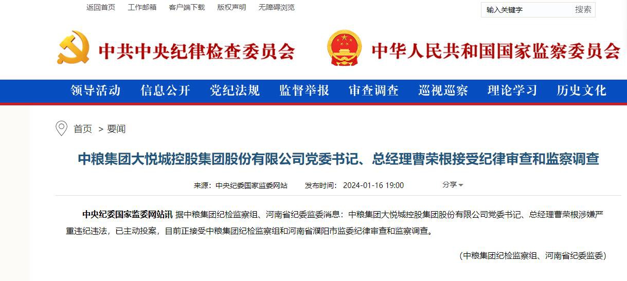 1月16日,據(jù)中央紀委國家監(jiān)委網(wǎng)站通報,中糧集團大悅城控股集團股份有限公司黨委書記、總經(jīng)理曹榮根涉嫌嚴重違紀違法,已主動投案,目前正接受中糧集團紀檢監(jiān)察組和河南省濮陽市監(jiān)委紀律審查和監(jiān)察調(diào)查。 此前,在2023年12月11日,大悅城控股集團股份有限公司發(fā)布公告稱,大悅城董事會收到公司董事、總經(jīng)理曹榮根提交的書面辭職報告。曹榮根由于年齡原因,申請辭去公司董事及董事會專門委員會委員職務、總經(jīng)理職務,辭職后不再擔任公司任何職務。 截至公告日,曹榮根持有大悅城控股11517股股票,辭職后將繼續(xù)嚴格按照相關法律法規(guī)的規(guī)定管理其所持股份。 公開資料顯示,曹榮根于1963年9月出生,江西靖安人,哈爾濱工業(yè)大學本科畢業(yè),曾任深圳寶恒集團副總經(jīng)理,深圳公司總經(jīng)理,有限公司執(zhí)行董事。自2017年5月開始,曹榮根擔任大悅城控股董事及總經(jīng)理,直至2023年12月。據(jù)大悅城控股2022年年報顯示,曹榮根當年的年薪為159.02萬元。 據(jù)悉,這并不是中糧集團近期首個被調(diào)查的高管。 2023年11月,據(jù)中央紀委國家監(jiān)委官網(wǎng)公布,中糧集團有限公司原黨組成員、副總經(jīng)理周政涉嫌嚴重違紀違法,目前正接受中央紀委國家監(jiān)委紀律審查和監(jiān)察調(diào)查。 |