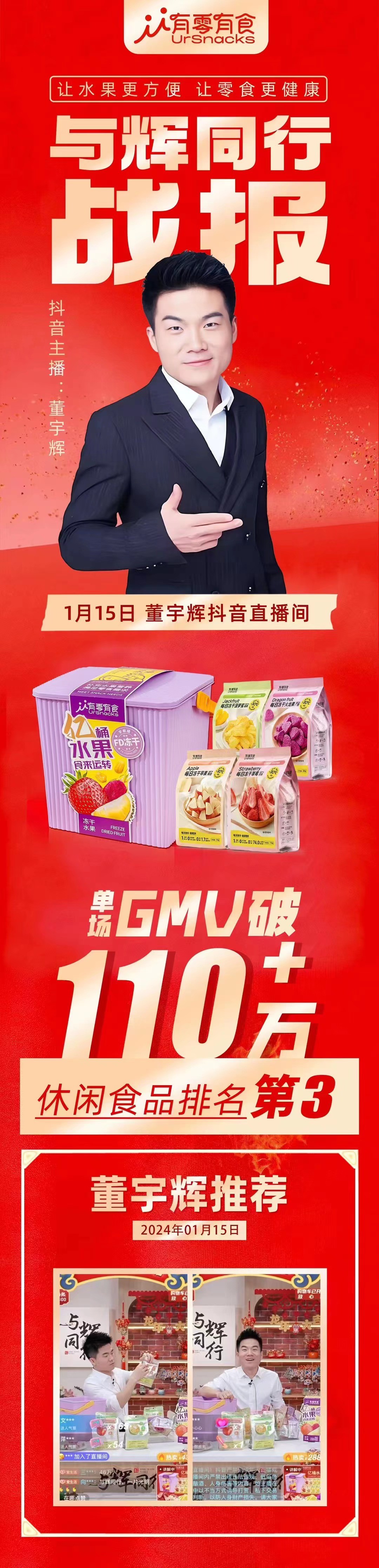 職業(yè)零售網(wǎng)獲悉,1月15日,【與輝同行】✖【有零有食】直播戰(zhàn)報(bào)顯示,單場GMV突破110萬+,全場休閑食品排名第三。 |