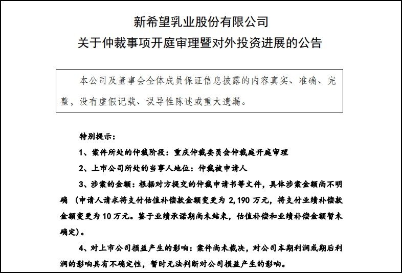 1月18日消息,新乳業(yè)公告,2024年1月17日,重慶仲裁委員會對公司涉及收購重慶新牛瀚虹實業(yè)有限公司60%股權一事的仲裁案件進行了不公開開庭審理。 庭審中申請人當庭變更仲裁請求為:裁決將《關于“一只酸奶!敝顿Y合作協(xié)議》第十二條第 2 款第二項約定的估值補償款“新希望乳業(yè)應收到的估值補償款=(10,500 萬元-新公司經(jīng)審計的業(yè)績承諾期內累計凈利潤) ÷3x11x60%”變更為“新希望乳業(yè)應收到的估值補償款為 2,190 萬元(暫定數(shù),以仲裁裁決結果為準)”。 裁決將《關于“一只酸奶牛”之投資合作協(xié)議》第十二條第 3 款約定的業(yè)績補償款“新公司應收到的業(yè)績補償款=12,743 萬元-新公司經(jīng)審計的業(yè)績承諾期內累計凈利潤,丁方支付給新公司的業(yè)績補償款以不超過 2,243 萬元為限”。變更為“新公司應收到的業(yè)績補償款為 10 萬元(暫定數(shù),以仲裁裁決結果為準)”。 重慶仲裁委員會未對本案進行當庭裁決,預計將在審理后擇期裁決。 |