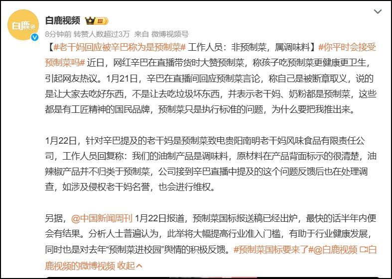 1月23日消息,近日,網(wǎng)紅辛巴在直播間回應(yīng)預(yù)制菜言論,稱自己是被斷章取義。 辛巴表示,老干媽、奶粉都是預(yù)制菜,這些都是有工匠精神的國(guó)民品牌,預(yù)制菜只是執(zhí)行標(biāo)準(zhǔn)的問(wèn)題,為什么要把我推出來(lái)。 有網(wǎng)友表示:“老干媽不是調(diào)味品嗎,跟預(yù)制菜有什么關(guān)系”“調(diào)味料成預(yù)制菜了?”“一本正經(jīng)地胡說(shuō)八道,吃了這么多年老干媽第一次知道這成了預(yù)制菜了??jī)艉丁钡鹊取?/div> 據(jù)國(guó)內(nèi)媒體報(bào)道,針對(duì)辛巴提及的老干媽是預(yù)制菜,貴陽(yáng)南明老干媽風(fēng)味食品有限責(zé)任公司工作人員回復(fù)稱:我們的油制產(chǎn)品是調(diào)味料,原材料在產(chǎn)品背面標(biāo)示的很清楚,油辣椒產(chǎn)品并不歸類于預(yù)制菜。 “公司接到辛巴直播中提及的這個(gè)問(wèn)題反饋后也在處理調(diào)查,如涉及侵權(quán)老干媽名譽(yù),也會(huì)進(jìn)行維權(quán)!痹摴ぷ魅藛T說(shuō)。 據(jù)了解,辛巴此前在直播帶貨時(shí)大贊預(yù)制菜,稱孩子吃預(yù)制菜更健康更衛(wèi)生,預(yù)制菜是全世界已知可以做到最健康的一種方式,此番言論引起網(wǎng)友熱議。 |