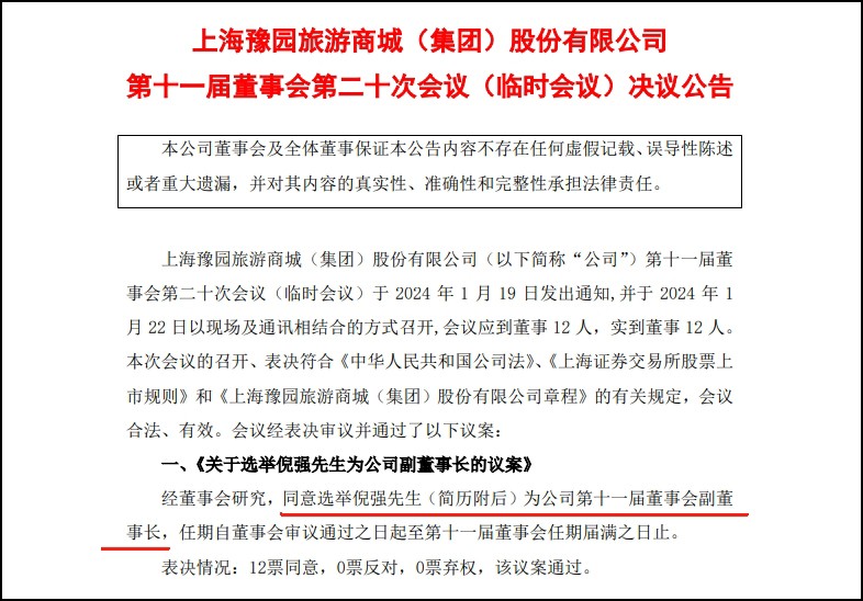1月22日,上海豫園旅游商城(集團)股份有限公司召開了第十一屆董事會第二十次會議(臨時會議),會議審議并通過了關(guān)于選舉倪強先生為公司副董事長的議案,以及關(guān)于調(diào)整公司第十一屆董事會發(fā)展戰(zhàn)略與投資委員會及審計與財務(wù)委員會組成人員的議案。 據(jù)公告,倪強先生被選舉為公司第十一屆董事會副董事長,其任期自董事會審議通過之日起至第十一屆董事會任期屆滿之日止。會議還對公司董事會發(fā)展戰(zhàn)略與投資委員會及審計與財務(wù)委員會的組成人員進行了調(diào)整。 公告顯示,倪強,男,1977年8月出生,碩士研究生,1998年10月加入中國共產(chǎn)黨,2000年7月參加工作。歷任上海良友(集團)有限公司企業(yè)策劃部、法律事務(wù)部總經(jīng)理;上海延華智能科技股份有限公司總裁助理;復(fù)地(集團)股份有限公司公共事務(wù)部總經(jīng)理、總裁助理、副總裁、高級副總裁;豫園股份副總裁、執(zhí)行總裁,兼任上海豫園商業(yè)發(fā)展集團董事長、東家文創(chuàng)集團董事長;復(fù)星蜂巢副董事長。現(xiàn)任中國青年企業(yè)家協(xié)會常務(wù)理事、中國酒業(yè)協(xié)會特邀副理事長、中國百貨商業(yè)協(xié)會特聘副會長。曾任共青團上海市委第十四屆委員會委員。 2022年3月至2024年1月?lián)卧@股份總裁(輪值)。 |