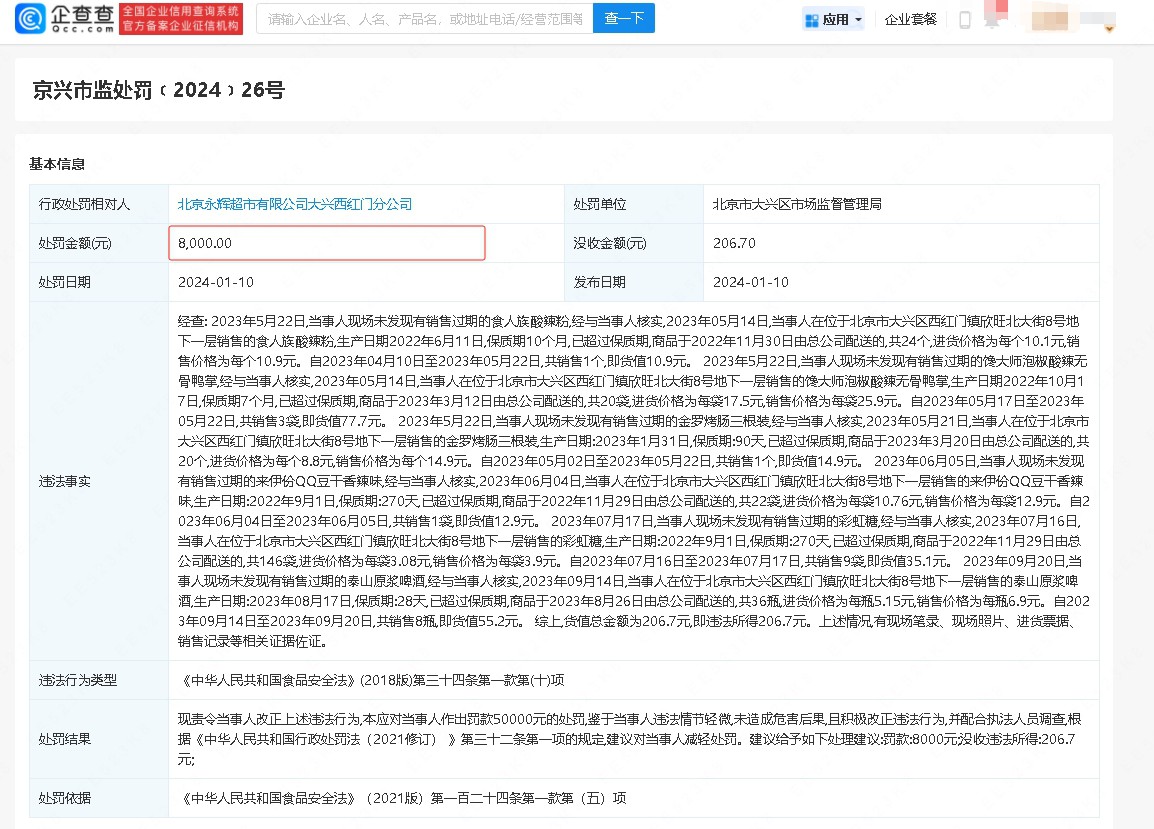 企查查App顯示,近日,北京永輝超市有限公司大興西紅門(mén)分公司因違反食品安全法,被北京市大興區(qū)市場(chǎng)監(jiān)督管理局罰款8000元,并沒(méi)收違法所得。 處罰事由顯示,2023年5月至9月間,當(dāng)事人銷(xiāo)售過(guò)期的食人族酸辣粉1個(gè)、饞大師泡椒酸辣無(wú)骨鴨掌3袋、金羅烤腸1個(gè)、來(lái)伊份QQ豆干香辣味1袋、彩虹糖9袋、泰山原漿啤酒8瓶,上述商品貨值總金額為206.7元。 |