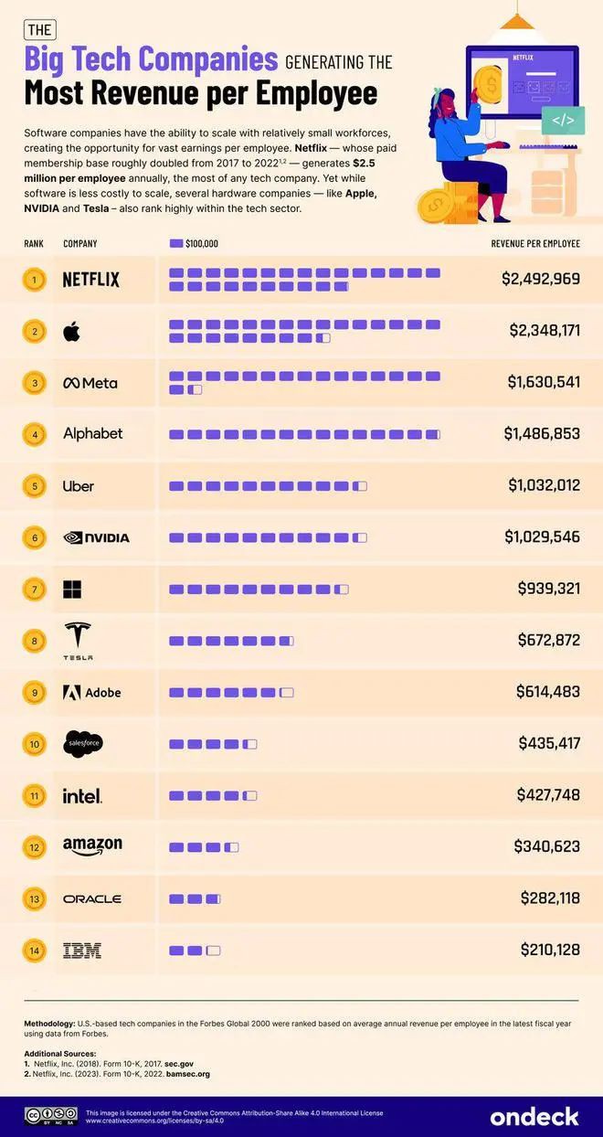 根據(jù)市場(chǎng)調(diào)查機(jī)構(gòu)Ondeck公布的最新報(bào)告,在人均創(chuàng)收最多的全球科技公司中,Netflix以249萬美元(約1785.3萬元)排名第一,蘋果公司以234.8萬美元(約1683.5萬元)排名第二。Ondeck 數(shù)據(jù)分析師基于福布斯全球2000強(qiáng)排行榜,分析了全球最大科技公司的員工人數(shù)和年收入情況,并分?jǐn)偟矫课粏T工上進(jìn)行排名。蘋果的員工人數(shù)是Meta的兩倍多,但收入?yún)s是Meta的三倍。在科技公司2023年的裁員浪潮中,得益于前期的謹(jǐn)慎擴(kuò)張,蘋果公司并未出現(xiàn)大規(guī)模裁員。(IT之家) |