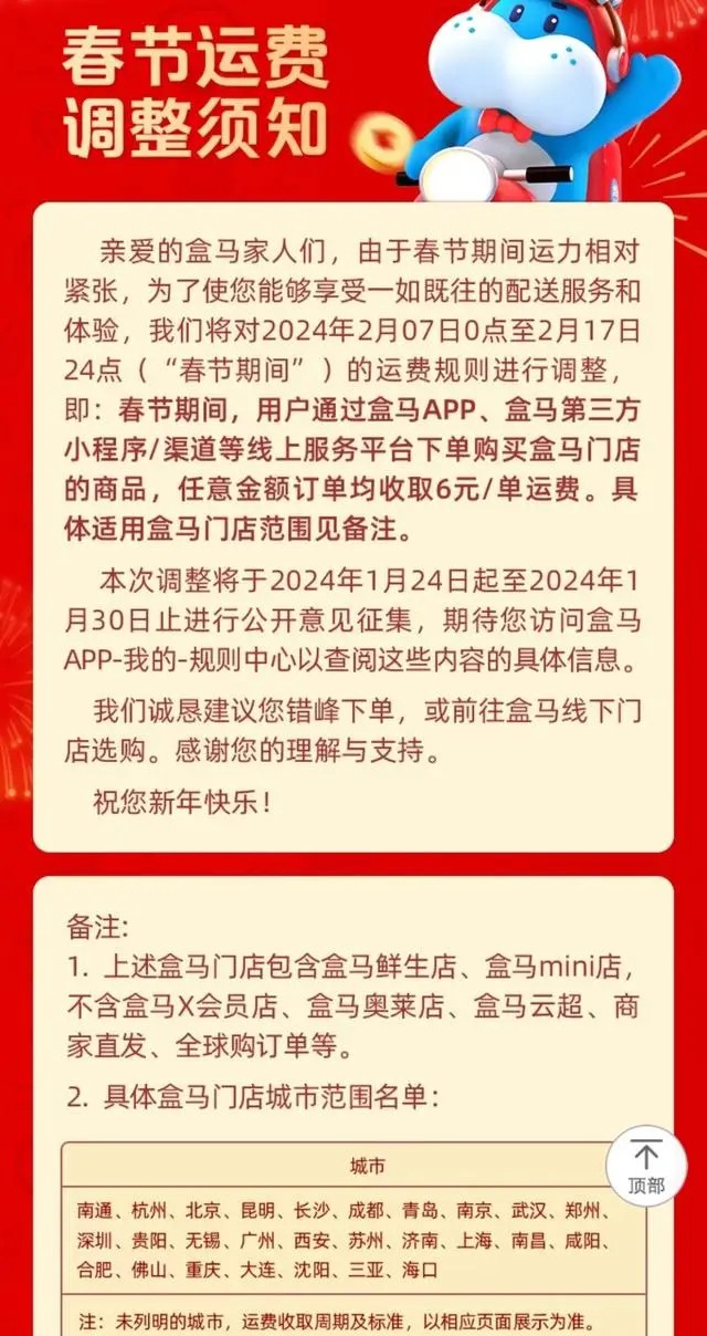 1月25日,在盒馬App上注意到,盒馬就調(diào)整春節(jié)運費規(guī)則征集消費者意見,其提到,由于春節(jié)期間運力相對緊張,盒馬將對2024年2月7日0點至2月17日24點的運費規(guī)則進行調(diào)整,用戶通過盒馬App、盒馬第三方小程序/渠道等線上服務(wù)平臺下單購買盒馬門店的商品,任意金額訂單均收取6元/單的運費。 盒馬提到,上述盒馬門店包含盒馬鮮生店、盒馬mini店,不含盒馬X會員店、盒馬奧萊店、盒馬云超、商家直發(fā)、全球購訂單等。具體盒馬門店城市范圍名單包含南通、杭州、北京、昆明、長沙、成都、青島、上海等27個城市,而未列明的城市,運費收取周期及標準,以相應(yīng)頁面展示為準。此次公開征集意見截止日期為2024年1月30日。 據(jù)了解,盒馬此前春節(jié)期間也會收取相應(yīng)運費,此次并非首次施行。 對此,盒馬客服稱,該政策目前還處于意見征求狀態(tài),是考慮到春節(jié)運力緊張導(dǎo)致的配送難度加大,往年也有加收。 |