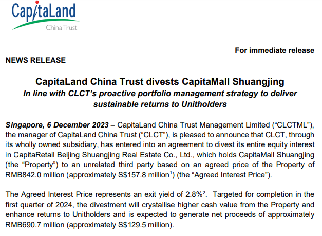 本文來源 / 地產(chǎn)資管界 1月27日,市場消息,凱德投資旗下凱德中國信托(CLCT)近日公告,已成功出售位于北京朝陽區(qū)東三環(huán)附近的凱德MALL•雙井購物中心,交易價格為8.42億元。 據(jù)了解,凱德MALL•雙井位于北京市朝陽區(qū)東三環(huán)附近,與多條公交線路相連,臨近地鐵7號線和14號線的九龍山地鐵站。該購物中心地下一層,地上三層,總面積49,463平米,主要吸引周邊社區(qū)及外籍消費者以及附近商業(yè)區(qū)的上班族。 此次交易價格折合每平米建筑面積為17023元,較其最新評估值12454元/平米提升了約36.7%。盡管如此,這個價格仍低于凱德信托在北京及廣州等其他一線城市購物中心的單價。 公告指出,此次出售價格折合年化NPI收益率為2.8%。相較于凱德商業(yè)信托其他一線城市購物中心的資本化率水平(約4.3%-5.3%),2.8%的收益率顯得較低。購物中心98.2%的面積長期租給家樂福和百安居兩個主力店,剩余面積租給幾個小租戶,收益穩(wěn)定但增長緩慢。 凱德投資資管規(guī)模1320億新元 資料顯示,凱德投資(CLI)是新加坡最大的全球房地產(chǎn)投資管理公司之一,其通過6支上市不動產(chǎn)投資信托基金(REITs)和商業(yè)信托以及遍及亞太、歐洲和美國的30多支私募基金持有。旗下多元化不動產(chǎn)資產(chǎn)類別涵蓋購物中心、辦公樓、旅宿、產(chǎn)業(yè)園區(qū)、工業(yè)及物流地產(chǎn)和數(shù)據(jù)中心。 截至2022年12月31日,凱德投資的資產(chǎn)管理規(guī)模為1,320億新元,基金資產(chǎn)管理規(guī)模約880億新元。 2023年8月,據(jù)凱德集團披露,凱德投資近期成功向全球機構(gòu)投資者募集約13億新元(約合9.5億美元),用于旗下三支私募基金。 包括,為凱德中國特殊機會伙伴計劃(CCOP計劃)募集的8.7億新元(6.5億美元);為凱德投資的旗艦區(qū)域性核心增值基金——凱德開放式不動產(chǎn)基金(COREF)募集的1.34億新元(1億美元);以及為新的印度產(chǎn)業(yè)園發(fā)展基金——凱德印度發(fā)展基金2(CIGF2)募集的2.63億新元(1.97億美元) |