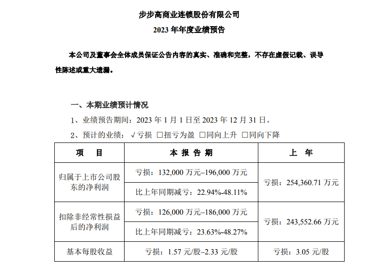 近日,步步高商業(yè)連鎖股份有限公司發(fā)布2023年度業(yè)績(jī)預(yù)告。 公告顯示,公司預(yù)計(jì)2023年度歸屬于上市公司股東的凈利潤(rùn)虧損在13.2億至19.6億元之間,相較上年同期的25.44億元虧損,減虧幅度為22.94%至48.11%。扣除非經(jīng)常性損益后的凈利潤(rùn)虧損預(yù)計(jì)在12.6億至18.6億元,相比上年同期的24.36億元虧損,減虧23.63%至48.27%。 步步高表示,報(bào)告期公司虧損的主要原因在于,2023年度公司所處行業(yè)競(jìng)爭(zhēng)態(tài)勢(shì)愈加嚴(yán)峻,疊加公司流動(dòng)性危機(jī),經(jīng)營(yíng)業(yè)績(jī)受到很大影響;公司調(diào)整經(jīng)營(yíng)策略,主動(dòng)進(jìn)行門店調(diào)優(yōu),淘汰扭虧無望門店,閉店支出較大;南城百貨受流動(dòng)性危機(jī)影響業(yè)績(jī)下滑,公司預(yù)計(jì)其商譽(yù)存在減值跡象。受公司內(nèi)、外部因素雙重影響,預(yù)計(jì)投資性房地產(chǎn)公允價(jià)值整體有所下降,最終公允價(jià)值變動(dòng)金額將由公司聘請(qǐng)的評(píng)估機(jī)構(gòu)及審計(jì)機(jī)構(gòu)進(jìn)行評(píng)估和審計(jì)后確定。 |