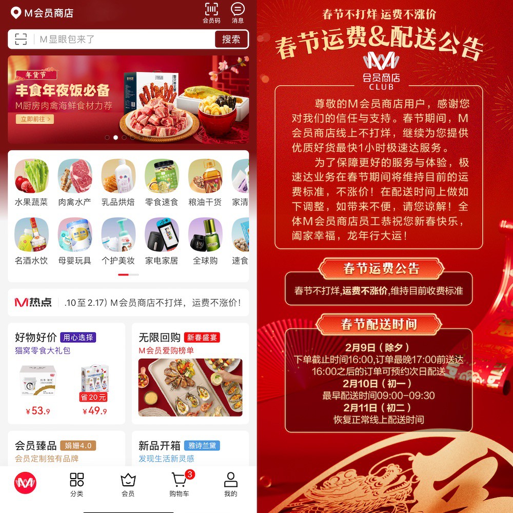 近日,M會員商店宣布春節(jié)不打烊,線上運費不漲價。線下門店過年期間正常營業(yè)(除夕2月9日9:00-18:00,正月初一至初八9:00-22:00);APP發(fā)布線上春節(jié)運費及配送公告,揚州、常州、南京、常熟M會員商店線上渠道在過年期間(2月10日—2月17日,正月初一至初八)運費不漲價,維持目前收費標(biāo)準(zhǔn)、優(yōu)質(zhì)好貨極速達服務(wù)持續(xù)保障。 M會員商店年貨節(jié)火熱進行中,據(jù)M會員商店相關(guān)數(shù)據(jù)統(tǒng)計,臨近春節(jié),線上日均訂單量環(huán)比上月增長了33%;年貨禮盒類受歡迎,M會員商店APP“年貨”“禮盒”關(guān)鍵詞搜索量占排名前2位;各店禮盒銷量環(huán)比上周呈5-10倍的增長。 M臻品、定制化單品成熱門選擇。M臻品貓山王榴蓮千層蛋糕,日銷突破1000盒;1月21日推出的M會員商店聯(lián)合海外品牌方好麗友共同定制的限量款貓窩造型零食大禮包受熱捧,上架僅兩周限量庫存已售出一半;卡皮巴拉毛絨公仔M會員店定制款成為“網(wǎng)紅”,吸引不少會員到店打卡,熱賣期單日銷量一度破百只。 除了各式年貨伴手禮,品質(zhì)年夜飯成為會員年味首選。整只帝王蟹禮盒、澳洲黑安格斯谷飼150天牛肉禮盒熱銷,銷量環(huán)比上月增長近10倍。 年貨節(jié)期間,M會員商店還上架了來自全球的30余種進口水果,智利車?yán)遄、比利時啤梨、以及產(chǎn)自意大利的佳沛奇異果等等。值得一提的是,M會員商店還是西班牙新鮮脆柿的全國首銷渠道。今年春節(jié),會員們能通過M會員商店嘗到來自西班牙核心產(chǎn)區(qū)的第一口鮮甜脆杮。 除了豐富的年節(jié)品質(zhì)商品,M會員商店春節(jié)期間活動精彩繼續(xù),不僅有“過年7天樂”每天活動不停歇;線下門店試吃活動也照常進行,每天固定時間段將為會員提供澳洲安格斯谷飼150天牛肉塊、黑安格斯后胸火鍋片、M臻品娟珊牛奶、進口青提、都樂贛南橙、手作黑虎蝦鍋貼等多品類商品豐富會員的體驗。 春節(jié)期間M會員商店線上線下不打烊,會員可以選擇到店購買,也可通過M會員商店APP在線下單,配送范圍內(nèi)最快1小時送到家。與家人分享暢享新春美食體驗美好瞬間。 |