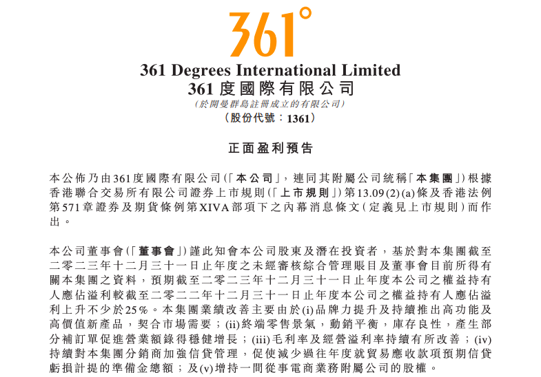 2月5日,361度發(fā)布公告,預(yù)期截至2023年12月31日止年度公司的權(quán)益持有人應(yīng)占溢利較截至2022年12月31日止年度公司的權(quán)益持有人應(yīng)占溢利上升不少于25%。 據(jù)悉,該集團(tuán)業(yè)績改善主要得益于品牌力提升及持續(xù)推出高功能及高價值新產(chǎn)品,以契合市場需要;終端零售景氣,動銷平衡,庫存良性,產(chǎn)生部分補訂單促進(jìn)營業(yè)額取得穩(wěn)健增長;毛利率及經(jīng)營溢利率持續(xù)有所改善;持續(xù)對集團(tuán)分銷商加強信貸管理,促使減少過往年度就貿(mào)易應(yīng)收款項預(yù)期信貸虧損計提的準(zhǔn)備金總額;以及增持一間從事電商業(yè)務(wù)附屬公司的股權(quán)。 |