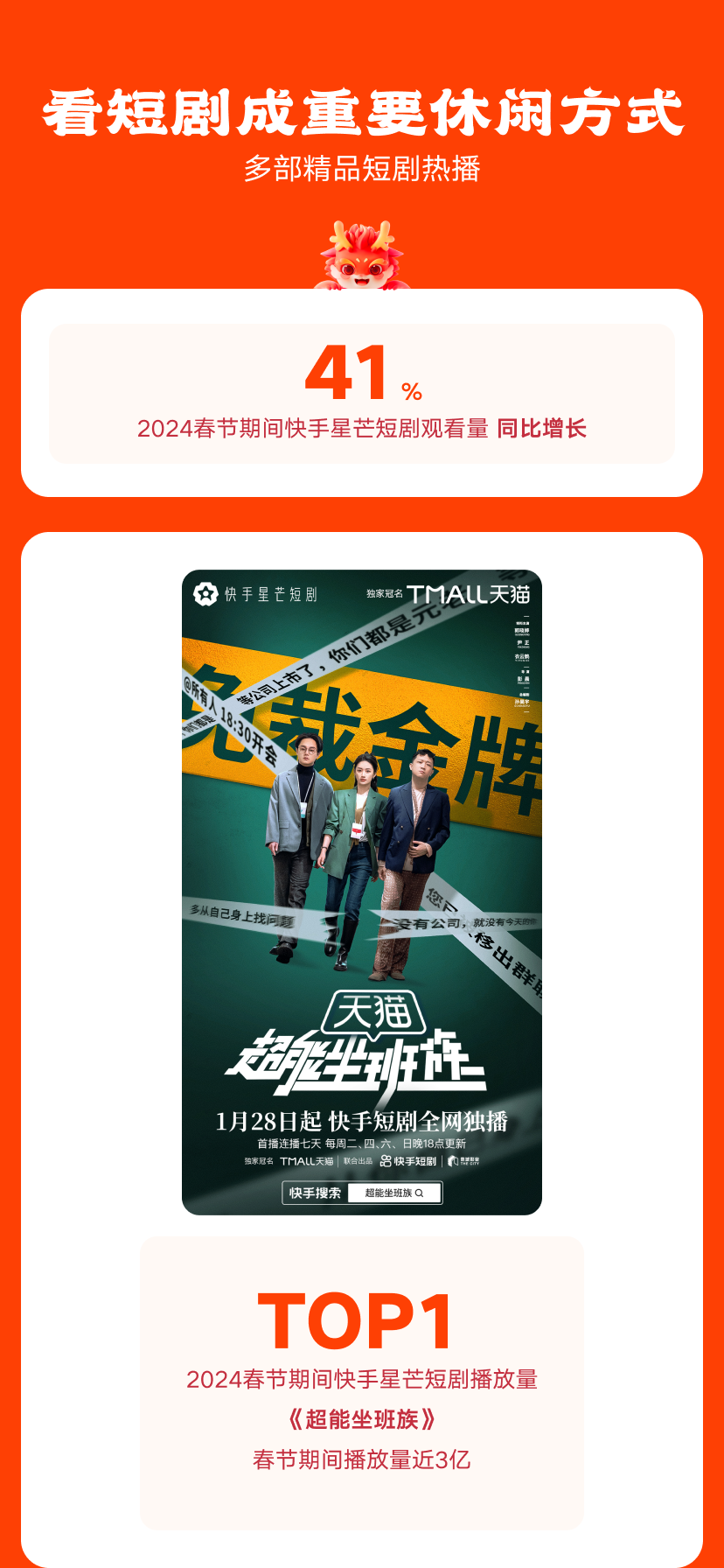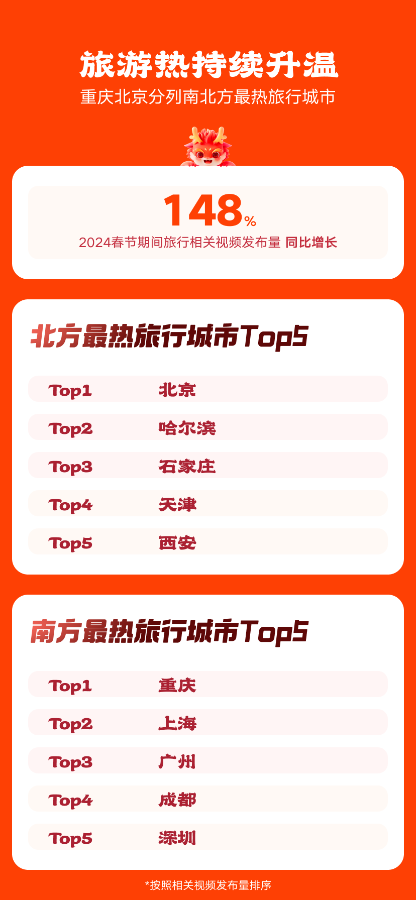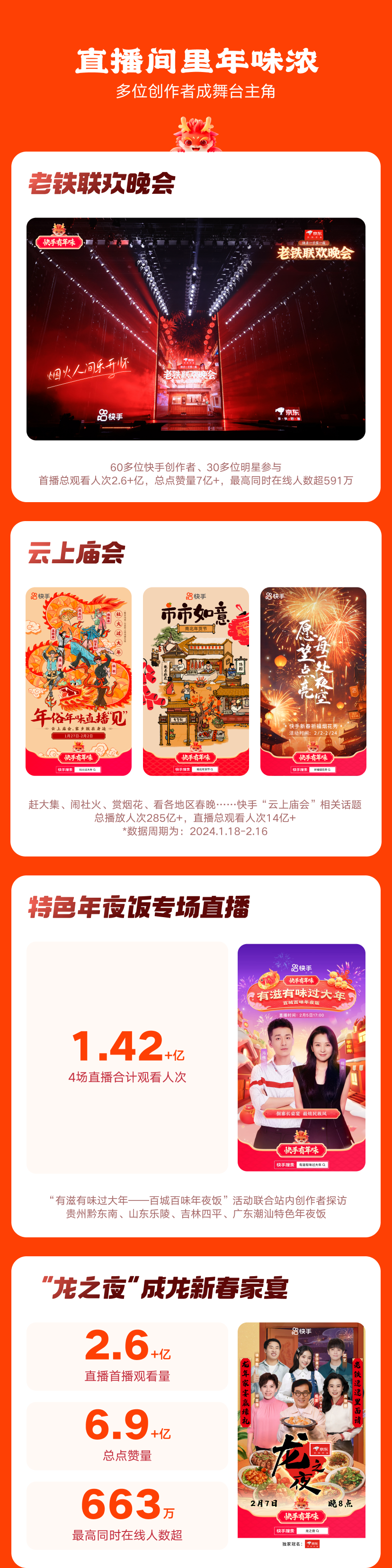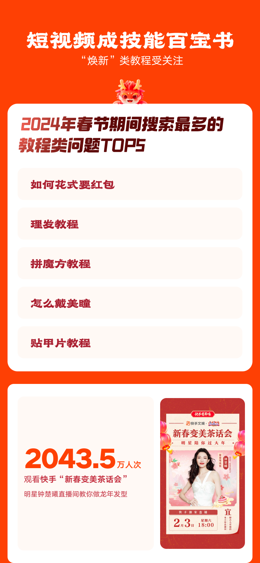 2月20日,快手發(fā)布了《2024快手春節(jié)報(bào)告》,其中詳細(xì)描繪了春節(jié)期間的各種熱鬧場景。 在這個(gè)報(bào)告中,帝王蟹以其獨(dú)特的魅力,擊敗了小酥肉和清蒸鱸魚,躋身最熱年夜飯Top6。與此同時(shí),“如何花式要紅包”成為了最受矚目的教程類問題,展現(xiàn)出人們對春節(jié)紅包的熱衷和期待。 春節(jié)期間,旅行、逛菜市場、看短劇等活動(dòng)持續(xù)升溫。在這個(gè)喜慶的時(shí)刻,重慶和北京分別成為了南北方最熱門的旅行城市,吸引了眾多游客前來感受當(dāng)?shù)鬲?dú)特的年味。此外,英歌舞、簪花圍等非遺民俗活動(dòng)也備受矚目,讓更多的人通過短視頻和直播領(lǐng)略到了中國傳統(tǒng)文化的魅力。 |