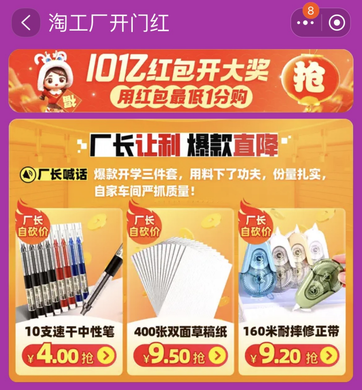 為迎接“開(kāi)工季”、“開(kāi)學(xué)季”,主打源頭工廠直供的淘工廠聯(lián)合各地產(chǎn)業(yè)帶工廠上線了開(kāi)工季、開(kāi)學(xué)季,以及春日潮流禮等爆款套件。不同以往,這次主題活動(dòng)主打一個(gè)讓源頭工廠廠長(zhǎng)現(xiàn)身說(shuō)法:不要買(mǎi)家自己討價(jià)還價(jià),廠長(zhǎng)完成“出廠前自己砍價(jià)”,為消費(fèi)者送上超值“開(kāi)門(mén)禮”。 據(jù)了解,此次主題活動(dòng)從2月17日持續(xù)到2月24日,淘工廠和源頭工廠密切聯(lián)動(dòng),分別針對(duì)節(jié)后開(kāi)工、開(kāi)學(xué)、春季換新以及元宵節(jié)等消費(fèi)場(chǎng)景,特別定制了4個(gè)系列主題活動(dòng),每場(chǎng)活動(dòng)核心主打“三件套”等爆款套件。 其中,開(kāi)工季核心推出手機(jī)支架、無(wú)痕膠帶和靜音加濕器“開(kāi)工三件套”,主打一個(gè)滿足打工人裝扮工位,營(yíng)造舒適工作環(huán)境的需求!伴_(kāi)學(xué)三件套”包括中性筆、雙面草稿紙、修正帶,量販?zhǔn)酱笕萘恐鞔蜃寣W(xué)生人群沒(méi)有使用顧慮。此外還有時(shí)令、節(jié)點(diǎn)氛圍的穿戴甲、項(xiàng)鏈、手鏈、假發(fā)、修眉刀等“春日潮流禮”,巧克力、綠豆餅、湯圓等“元宵禮”,應(yīng)景感即視。 這次“開(kāi)門(mén)紅”活動(dòng),不僅緊扣不同人群消費(fèi)的核心需求,更是主打一個(gè)誠(chéng)意。以源頭工廠直供為特色,淘工廠這次更是將這一優(yōu)勢(shì)發(fā)揮到了極致,省掉消費(fèi)者自己去討價(jià)還價(jià)。淘工廠聯(lián)合諸多產(chǎn)業(yè)帶工廠老板,讓廠長(zhǎng)現(xiàn)身說(shuō)法,出廠前直接完成“自砍價(jià)”,出廠后直接是擊穿底價(jià):“開(kāi)工三件套”之一的4.5L大容量靜音加濕器僅售32.9元,“開(kāi)學(xué)三件套”之一的400張雙面草稿紙僅售9.5元,“春日潮流禮”格紋甜心穿戴甲僅售8.32元。 主做手機(jī)支架、數(shù)據(jù)線等3C類產(chǎn)品的深圳市如一實(shí)業(yè)有限公司也參加了此次活動(dòng)!拔覀児と诉沒(méi)完全到位,復(fù)工三天訂到已經(jīng)三四萬(wàn)單了”。一位銷售負(fù)責(zé)人告訴記者,2月14日恢復(fù)開(kāi)工以來(lái),他們逐步恢復(fù)了供給,參與了“開(kāi)工季”主題活動(dòng)后,業(yè)績(jī)一日比一日表現(xiàn)好,“每天能比前一天多一萬(wàn)單,算是個(gè)開(kāi)門(mén)紅”。 據(jù)了解,深圳市如一實(shí)業(yè)有限公司自2022年加入淘工廠,是產(chǎn)銷一體的廠商,目前淘工廠業(yè)績(jī)占到總收入的30%以上。因?yàn)橥ㄟ^(guò)淘工廠掌握了這個(gè)類目的節(jié)后消費(fèi)需求規(guī)律,節(jié)前已經(jīng)備好了10萬(wàn)件貨,“隨著生產(chǎn)線逐步恢復(fù),可以敞開(kāi)供應(yīng)市場(chǎng)需求”。工廠也在這次“自砍價(jià)”的策略中感受到了出廠價(jià)對(duì)消費(fèi)者的吸引力。 據(jù)淘工廠介紹,今年節(jié)后性價(jià)比消費(fèi)熱情大漲,再加上大家對(duì)龍年盼頭和熱情較大,也帶動(dòng)了一波供給側(cè)的熱情。目前,入駐淘工廠產(chǎn)業(yè)帶的廠商已有近7成進(jìn)入開(kāi)工狀態(tài)。年前淘工廠面向產(chǎn)業(yè)帶廠商釋啟動(dòng)了新品傭金激勵(lì)計(jì)劃也帶動(dòng)了新供給的入駐熱情,目前正在紛紛對(duì)接入駐。 資料顯示,淘工廠通過(guò)M2C模式在生產(chǎn)端鏈接了10萬(wàn)產(chǎn)業(yè)帶工廠,在消費(fèi)端鏈接了3億性價(jià)比消費(fèi)人群。眼下,淘工廠正在通過(guò)“更簡(jiǎn)單”的運(yùn)營(yíng)方式,幫助產(chǎn)業(yè)帶大鏈主、品牌工廠、優(yōu)質(zhì)工廠以及中小企業(yè)以更低成本、更高效率將優(yōu)質(zhì)供給直達(dá)消費(fèi)者眼前,讓產(chǎn)消兩端感知“國(guó)民工廠”的價(jià)值和魅力。 |