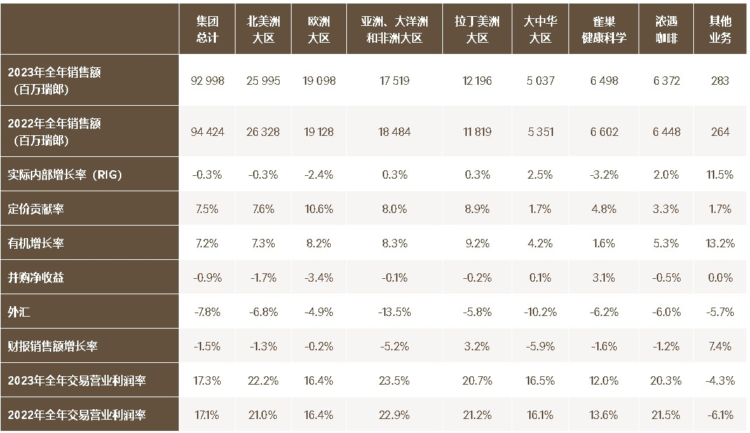 有機增長率達到7.2%,定價貢獻率達到7.5%,實際內部增長率為負0.3%。增長得益于絕大多數(shù)地區(qū)和品類的表現(xiàn)。 全年財報總銷售額減少1.5%,至930億瑞士法郎(2022年:944億瑞士法郎)。匯率致使銷售額下降了7.8%。凈資產剝離帶來的負面影響為0.9%。 基礎交易營業(yè)利潤率(UTOP)達到17.3%,在財報基礎上增加20個基點,按固定貨幣計算增加40個基點。交易營業(yè)利潤率(TOP)達到15.6%,增加了160個基點。 每股基礎收益按固定匯率計算增加8.4%,按財報計算增加0.1%至4.80瑞士法郎。每股收益在財報基礎上增加23.7%至4.24瑞士法郎,主要反映了前一年的一次性項目。 得益于運營資本的顯著減少,自由現(xiàn)金流增加了38億瑞士法郎,至104億瑞士法郎。 2024年展望: 公司預期2024年集團銷售額有機增長率為4%左右,基礎交易營業(yè)利潤率適度增加。按固定貨幣計算的每股基礎收益預計提高6%至10%。 2025年中期目標得到全部確認:預期銷售額持續(xù)中個位數(shù)有機增長,基礎交易營業(yè)利潤率在2025年達到17.5%至18.5%之間。按固定貨幣計算的每股基礎收益提高6%至10%。 雀巢集團首席執(zhí)行官馬克·施奈德表示:“在過去兩年中,前所未有的通貨膨脹讓許多消費者面對的壓力與日俱增,同時影響了其對食品和飲料產品的需求。在這個充滿挑戰(zhàn)的背景下,我們通過增加營銷投入和其他增長性投資,實現(xiàn)了強勁的有機增長和利潤率的長足提升。我們的自由現(xiàn)金流回歸到歷史均位。 展望2024年,我們將通過積極的創(chuàng)新和改良,為消費者提供更高端、優(yōu)質的產品和服務、更可負擔和更有營養(yǎng)的選擇等方式,為消費者提升價值,結合更多的品牌支持,實現(xiàn)以銷量和組合為主導的增長,這將是我們2024年的優(yōu)先工作。我們的資本配置重點將繼續(xù)放在那些快速增長的‘10億俱樂部’品牌上,繼而在實現(xiàn)穩(wěn)定增長的同時提升品牌忠誠度。 為了提升市場份額,我們的關鍵重心將放在通過差異化的產品和服務,為消費者帶來愉悅和滿意度上,同時專注于卓越的執(zhí)行。在正確的戰(zhàn)略、產品組合和所需能力的加持下,我們對實現(xiàn)2025年的目標充滿信心! 集團銷售 有機增長率為7.2%,定價貢獻率為7.5%,反映了過去兩年的成本通脹。實際內部增長率為負0.3%,主要受到消費者需求疲軟,產能受限以及第二季度維生素、礦物質和營養(yǎng)補充劑供應暫時中斷的影響。正如預期所示,實際內部增長率在第四季度和下半年實現(xiàn)正增長,這得益于產品組合優(yōu)化、客戶服務水平提升以及品牌支持的增加。 集團在大多數(shù)地區(qū)和品類中取得了廣泛增長。在定價和負的實際內部增長的影響下,發(fā)達市場的有機增長率為6.4%。在定價和正增長的實際內部增長的推動下,新興市場的有機增長率為8.4%。 從產品類別來看,普瑞納寵物護理業(yè)務是有機增長的最大貢獻者,各渠道都表現(xiàn)出強勁的勢頭。普瑞納萬牌(ONE)、普瑞納冠能和喜躍的銷售額都實現(xiàn)了雙位數(shù)的增長。普瑞納冠能的銷售額接近30億瑞士法郎。得益于居家外渠道的強勁需求,咖啡實現(xiàn)了高個位數(shù)的增長,各品牌都得到了積極發(fā)展。在母乳低聚糖(HMOs)配方及特殊營養(yǎng)配方等高端嬰兒配方奶粉的持續(xù)拉動下,嬰兒營養(yǎng)業(yè)務實現(xiàn)了高個位數(shù)的增長。 有賴于營養(yǎng)強化奶制品、咖啡伴侶和家庭烘焙產品的帶動,乳制品業(yè)務實現(xiàn)了中個位數(shù)增長。糖果業(yè)務實現(xiàn)了高個位數(shù)增長,這得益于奇巧持續(xù)的雙位數(shù)增長勢頭。預制食品和烹飪輔料產品實現(xiàn)了中個位數(shù)增長,體現(xiàn)出各地區(qū)和細分市場對美極的需求強勁。受到圣培露和普娜水的帶動,水業(yè)務實現(xiàn)了中個位數(shù)增長。由于維生素、礦物質和補充劑的暫時供應限制部分抵消了醫(yī)療營養(yǎng)品的持續(xù)強勁增長,雀巢健康科學業(yè)務實現(xiàn)了低個位數(shù)的增長。 按渠道劃分,零售業(yè)務的有機增長率為6.5%,保持了持續(xù)的強勁走勢。電子商務銷售額增長了13.4%,達到集團總銷售額的17.1%。居家外渠道的有機增長達到15.9%。 凈資產剝離導致銷售額下降0.9%,主要與剝離Freshly的多數(shù)股權以及出售Gerber Good Start嬰兒配方奶粉品牌有關。由于瑞士法郎大幅升值,匯率對銷售額的影響為負7.8%。財報的總銷售額下降了1.5%,達到930億瑞士法郎。 大中華大區(qū) 有機增長率4.2%:實際內部增長率2.5%;定價貢獻率1.7% 大中華大區(qū)的基礎交易營業(yè)利潤率增加了40個基點,達到16.5% 2023年,雀巢集團在大中華大區(qū)的凈凈銷售額折合人民幣436億元。其中食品飲料業(yè)務有機增長率4.2%,包含銷量貢獻率2.5%,定價貢獻率1.7%。 大中華大區(qū)的增長主要得益于居家外渠道銷售和電商渠道的強勁勢頭。速溶咖啡、寵物食品和糖果業(yè)務的市場份額有所增長。 在產品品類方面,得益于創(chuàng)新和分銷拓展,雀巢專業(yè)餐飲是最大的增長貢獻者。太太樂居家外餐飲渠道和新產品的需求增加推動了調味品業(yè)務實現(xiàn)高個位數(shù)增長。受到脆脆鯊和徐福記業(yè)務的推動,糖果業(yè)務實現(xiàn)中個位數(shù)增長。得益于能恩低敏配方和特殊營養(yǎng)解決方案,嬰兒營養(yǎng)業(yè)務實現(xiàn)正增長。在