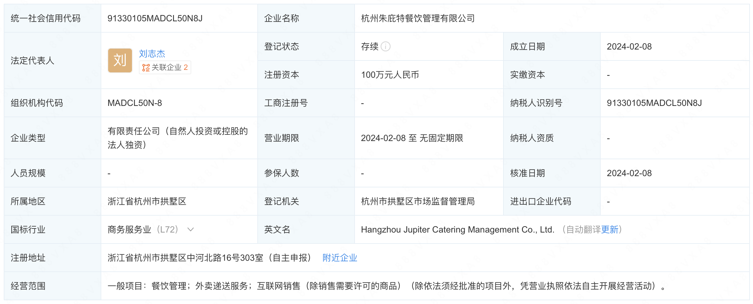 天眼查App顯示,近日,杭州朱庇特餐飲管理有限公司成立,法定代表人為劉志杰,注冊資本100萬人民幣,經(jīng)營范圍為餐飲管理、外賣遞送服務、互聯(lián)網(wǎng)銷售。 股權(quán)全景穿透圖顯示,該公司由杭州福玻斯文化發(fā)展有限公司全資持股,后者由王思聰、李欣分別持股90%、10%。 |