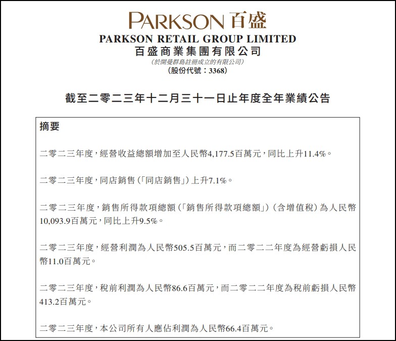 2月26日,百盛集團(tuán)發(fā)布截至2023年12月31日止年度業(yè)績,該集團(tuán)期內(nèi)取得收益36.45億元,同比增加10.45%;公司所有人應(yīng)占年度利潤6641.3萬元,去年同期則公司所有人應(yīng)占虧損3.84億元;每股基本盈利0.025元。 公告稱,2023年度,銷售所得款項(xiàng)總額(含增值稅)約為100.94億元,同比上升9.5%;其中商品銷售總額約為77.91億元,同比上升約5.9%。期內(nèi)同店銷售上升7.1%。集團(tuán)商品銷售毛利率相較上年保持穩(wěn)定于13.5%。2023年度,租金收入上升72.0%及同店銷售上升7.1%。 報(bào)告期內(nèi),百盛集團(tuán)開設(shè)了兩家百盛購物中心,即宜春門店和南昌蓮塘門店,分別為該集團(tuán)在江西省的第三家及第四家門店。集團(tuán)實(shí)施「一市多店」以及「模式創(chuàng)新」的策略,以適應(yīng)不斷變化的消費(fèi)模式。 截至期末,百盛集團(tuán)在中國29個(gè)城市及老撾運(yùn)營管理43家百盛門店(包括百貨店、購物廣場、城市奧特萊斯、「Parkson Beauty」概念店及超市)及2家百盛優(yōu)客城市廣場。 |