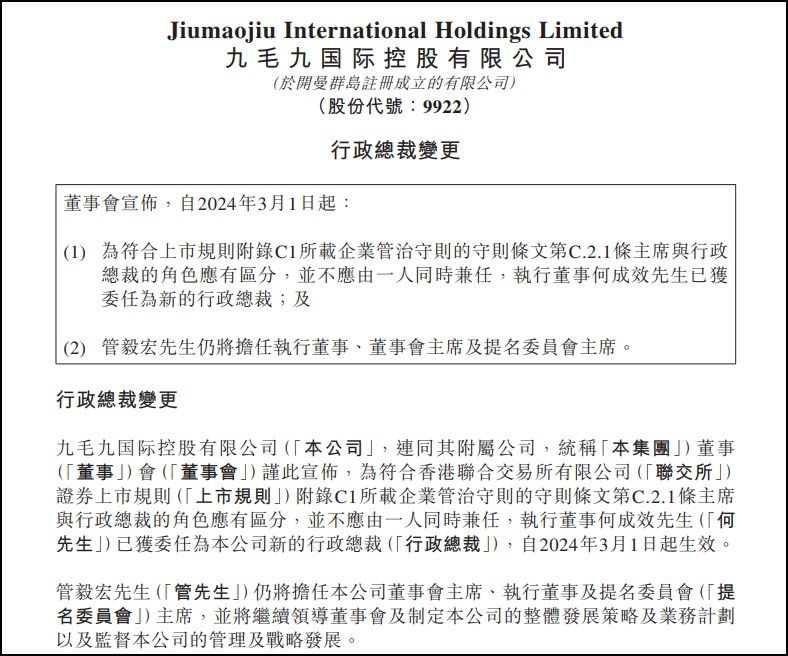 2月29日,九毛九國(guó)際控股有限公司宣布,自2024年3月1日起,為符合上市規(guī)則,執(zhí)行董事何成效先生將接替管毅宏先生成為新的行政總裁。管毅宏先生將繼續(xù)擔(dān)任執(zhí)行董事、董事會(huì)主席及提名委員會(huì)主席。 此次變動(dòng)是根據(jù)香港聯(lián)合交易所有限公司證券上市規(guī)則附錄C1所載企業(yè)管治守則第C.2.1條,主席與行政總裁角色應(yīng)區(qū)分,不得由同一人兼任。 何成效先生現(xiàn)年46歲,于2013年加入集團(tuán),曾任廣州太二餐飲連鎖有限公司總經(jīng)理,并在2020年7月2日被委任為執(zhí)行董事。何成效在品牌及運(yùn)營(yíng)管理方面擁有豐富經(jīng)驗(yàn),曾于1999年至2013年在廣東三元麥當(dāng)勞食品有限公司工作,并在離開(kāi)前擔(dān)任運(yùn)營(yíng)經(jīng)理。他畢業(yè)于廣東外語(yǔ)外貿(mào)大學(xué),主修國(guó)際金融。何成效作為行政總裁及執(zhí)行董事,年薪為人民幣120萬(wàn)元,另加福利及酌情花紅。 據(jù)悉,何成效持有本公司170.48萬(wàn)股股份權(quán)益,包括153.48萬(wàn)份購(gòu)股權(quán)。他還持有MTJ Limited 2.1%的股權(quán),而MTJ Limited持有九毛九國(guó)際控股約2.6%的股權(quán)。 董事會(huì)確認(rèn),與何成效的任命無(wú)關(guān)的事宜無(wú)需通知聯(lián)交所或股東,并對(duì)他的加入表示歡迎。 |