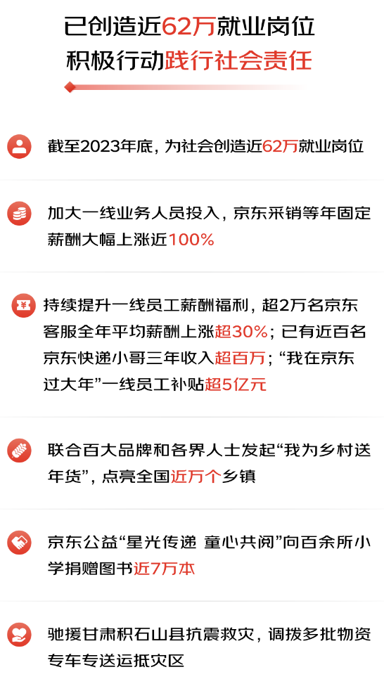 3月6日,京東集團(tuán)發(fā)布了2023年四季度及全年業(yè)績(jī),受益于過(guò)去一年來(lái)堅(jiān)定的戰(zhàn)略執(zhí)行、激昂的團(tuán)隊(duì)斗志和破圈的業(yè)務(wù)創(chuàng)新,始終把用戶體驗(yàn)放在首位,通過(guò)降低成本、提升效率為消費(fèi)者、品牌和商家創(chuàng)造實(shí)實(shí)在在的價(jià)值,不僅保持了業(yè)績(jī)?cè)鲩L(zhǎng)的超預(yù)期,更帶動(dòng)了品牌、商家和京東駛?cè)肓夹园l(fā)展通道。 2023年,京東集團(tuán)繼續(xù)保持穩(wěn)健增長(zhǎng),四季度收入達(dá)到3,061億元人民幣(約431億美元),同比增長(zhǎng)3.6%;全年收入10,847億元人民幣(約1,528億美元),同比增長(zhǎng)3.7%;作為核心品類(lèi)的電子產(chǎn)品及家用電器商品收入同比增速在四季度繼續(xù)保持高于行業(yè)平均水平,日用百貨商品收入同比實(shí)現(xiàn)正增長(zhǎng)。在免傭降費(fèi)等大力扶持中小商家運(yùn)營(yíng)的舉措下,四季度服務(wù)收入仍達(dá)到596億元人民幣(約84億美元),全年服務(wù)收入達(dá)2,134億元人民幣(約301億美元),同比增長(zhǎng)17.8%。2023年,京東物流服務(wù)外部客戶的收入同比增長(zhǎng)了30.8%,其中一體化供應(yīng)鏈單客戶平均收入同比增長(zhǎng)15.2%。 對(duì)“多快好省”用戶體驗(yàn)的極致追求和近百萬(wàn)商家的繁榮生態(tài),帶動(dòng)了京東的季度活躍用戶數(shù)在四季度實(shí)現(xiàn)加速增長(zhǎng),用戶平均購(gòu)物頻次也在持續(xù)提升。2023年,第三方商家數(shù)量同比增長(zhǎng)了188%,一年內(nèi)新增商家數(shù)量同比增長(zhǎng)4.3倍。 四季度,京東集團(tuán)在非美國(guó)通用會(huì)計(jì)準(zhǔn)則下歸屬于上市公司普通股股東的凈利潤(rùn)為84億元人民幣(約12億美元),全年達(dá)到352億元人民幣(約50億美元),均超出市場(chǎng)預(yù)期。 3月6日,京東集團(tuán)同步公告稱(chēng),公司董事會(huì)已批準(zhǔn)年度現(xiàn)金股利,股利總額約為12億美元,超出2023年的10億美元。京東集團(tuán)董事會(huì)同時(shí)批準(zhǔn)一項(xiàng)新股份回購(gòu)計(jì)劃,于現(xiàn)有股份回購(gòu)計(jì)劃屆滿生效后,可在截至2027年3月的未來(lái)36個(gè)月內(nèi)回購(gòu)價(jià)值不超過(guò)30億美元的股份。 截至2023年底,京東已為近62萬(wàn)人創(chuàng)造了高質(zhì)量的就業(yè)崗位。2023年全年的人力資源總支出(包括公司的自有員工和外部人員)達(dá)到了1,047億元人民幣。從2024年初開(kāi)始,京東提升了采銷(xiāo)、客服等員工的薪酬激勵(lì)和福利保障。 “隨著四季度收入和盈利能力的提升,我們很高興以強(qiáng)勁的勢(shì)頭收官2023年,”京東集團(tuán)首席執(zhí)行官許冉女士表示!熬〇|采取的主動(dòng)調(diào)整措施已見(jiàn)成效,對(duì)用戶體驗(yàn)、價(jià)格競(jìng)爭(zhēng)力和平臺(tái)生態(tài)的明確堅(jiān)定的戰(zhàn)略聚焦為我們帶來(lái)更深層、更高頻次的用戶參與度,以及更健康的用戶增長(zhǎng)趨勢(shì)。2024年,我們將以用戶體驗(yàn)提升和市場(chǎng)份額增長(zhǎng)為重點(diǎn),為用戶、業(yè)務(wù)合作伙伴和股東創(chuàng)造更多價(jià)值! 01 京東采銷(xiāo)“三戰(zhàn)三捷” 京東服務(wù)引領(lǐng)行業(yè)標(biāo)桿 用戶體驗(yàn)是京東做事的起點(diǎn)和終點(diǎn),豐富商品、優(yōu)化價(jià)格、提升服務(wù)是用戶體驗(yàn)的核心,也是京東的發(fā)力點(diǎn)。 從2023年初啟動(dòng)以來(lái),“春曉計(jì)劃”不斷升級(jí),通過(guò)簡(jiǎn)化入駐流程、減費(fèi)降扣、流量激勵(lì)、經(jīng)營(yíng)工具提效等加大對(duì)中小商家的扶持力度,在商家數(shù)量大幅增長(zhǎng)的同時(shí),也為消費(fèi)者帶來(lái)了更加豐富的商品選擇。截至2023年底,京東三方商家數(shù)量已近百萬(wàn),三方商家的商品SKU數(shù)量較年初增長(zhǎng)了近一倍。 2023年,京東借助智能供應(yīng)鏈與品牌商共創(chuàng)了近千款C2M新品,其中10%成為了相應(yīng)品牌的銷(xiāo)量冠軍,有30%在半年內(nèi)的銷(xiāo)售額突破千萬(wàn)。京東還在日本、韓國(guó)及歐洲設(shè)立三大直采中心,通過(guò)在全球構(gòu)建京東自營(yíng)買(mǎi)手網(wǎng)絡(luò),不斷提升國(guó)際供應(yīng)鏈能力,滿足了消費(fèi)者多元化的低價(jià)正品進(jìn)口消費(fèi)體驗(yàn)。 京東采銷(xiāo)四季度以來(lái)“三戰(zhàn)三捷”,為用戶推薦了海量的極致性價(jià)比商品,讓京東的低價(jià)形象更加深入人心。 在11.11期間,京東采銷(xiāo)直播火爆出圈,總觀看人數(shù)突破3.8億;隨后在京東獨(dú)家冠名的湖南衛(wèi)視芒果TV跨年晚會(huì),與晚會(huì)同頻進(jìn)行的京東采銷(xiāo)直播間5個(gè)小時(shí)內(nèi)觀看人次超1億;作為中央廣播電視總臺(tái)2024年春節(jié)聯(lián)歡晚會(huì)獨(dú)家互動(dòng)合作平臺(tái),春晚期間用戶在京東的互動(dòng)量超552億次,京東采銷(xiāo)在“春晚同款”會(huì)場(chǎng)推薦的熱門(mén)商品銷(xiāo)售火爆。 在豐富商品供給和增加高性價(jià)比商品的同時(shí),2023年,京東相繼推出了“百億補(bǔ)貼”、“9塊9包郵”頻道,以及免郵門(mén)檻下調(diào)等一系列低價(jià)舉措。在已有9成第三方商品包郵的基礎(chǔ)上,今年3月底將對(duì)其余近10%第三方商品普及最高滿59元包郵。 京東服務(wù)始終是