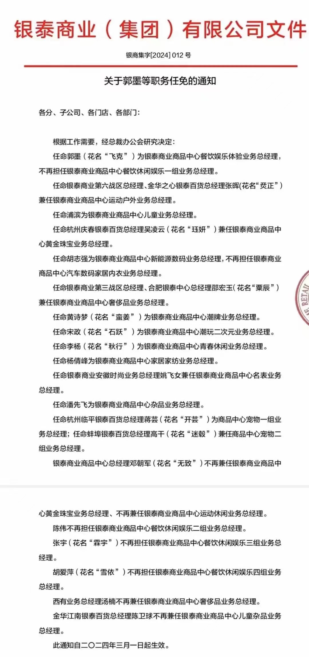 近日,銀泰商業(yè)(集團(tuán))發(fā)布人事變動(dòng),部分高管職務(wù)發(fā)生了變化,涉及20人。 在任命了郭墨、張暉、浦濱、吳凌云、胡志強(qiáng)、邵宏玉、黃詩(shī)夢(mèng)、宋政、李楊、楊倩峰、姚飛女、潘先飛、蔣蕓、高干等一批高管的同時(shí),銀泰商業(yè)(集團(tuán))也免去了鄧朝軍、陳偉、張宇、胡愛萍、湯楠、陳衛(wèi)球等高管的部分職務(wù)。 本次人事變動(dòng)自2024年3月1日期正式生效。 2月1日,有媒體報(bào)道稱,阿里巴巴集團(tuán)正在考慮出售旗下百貨和購(gòu)物中心運(yùn)營(yíng)商銀泰商業(yè)。報(bào)道稱,早在2023年底蔡崇信出任阿里董事會(huì)主席時(shí),出售計(jì)劃就已啟動(dòng)。目前,阿里已經(jīng)接觸了幾家擁有潛在收購(gòu)意向的公司。 |