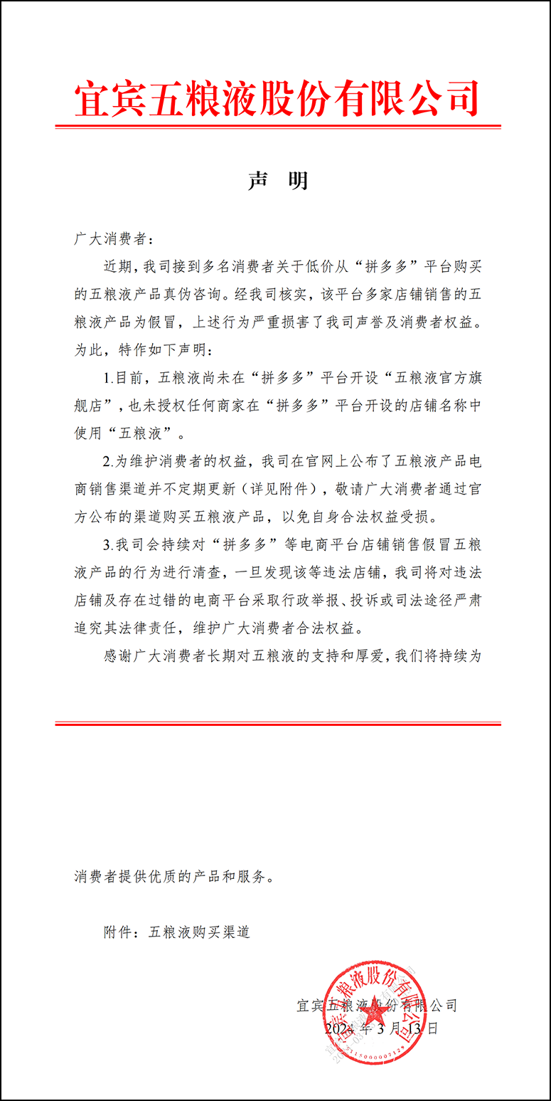 3月13日晚間,五糧液官網(wǎng)發(fā)布聲明稱,近期,公司接到多名消費者關(guān)于低價從“拼多多”平臺購買的五糧液產(chǎn)品真?zhèn)巫稍。?jīng)公司核實,該平臺多家店鋪銷售的五糧液產(chǎn)品為假冒,上述行為嚴重損害了五糧液聲譽及消費者權(quán)益。 五糧液:將嚴肅追究法律責(zé)任 五糧液表示,目前,公司尚未在“拼多多”平臺開設(shè)“五糧液官方旗艦店”,也未授權(quán)任何商家在“拼多多”平臺開設(shè)的店鋪名稱中使用“五糧液”。 公司會持續(xù)對“拼多多”等電商平臺店鋪銷售假冒五糧液產(chǎn)品的行為進行清查,一旦發(fā)現(xiàn)該等違法店鋪,將對違法店鋪及存在過錯的電商平臺采取行政舉報、投訴或司法途徑嚴肅追究其法律責(zé)任,維護廣大消費者合法權(quán)益。 圖片來源:五糧液官網(wǎng) 拼多多官方客服:會嚴肅處罰 對于五糧液的打假聲明,拼多多官方客服對中國證券報記者表示,對于賣家售賣假冒品牌的行為,會進行嚴肅的處罰,處罰措施包括但不限于商品下架、全店下架、清退等。 值得注意的是,五糧液副董事長張宇曾在一場行業(yè)論壇上表示,電子商務(wù)的高速發(fā)展,為企業(yè)發(fā)展帶來了新的經(jīng)濟增長點。但由于名優(yōu)白酒網(wǎng)絡(luò)銷售過程中的電商平臺審查機制不健全、經(jīng)營過程監(jiān)管不到位等因素,電商平臺、直播帶貨、朋友圈營銷等領(lǐng)域頻繁出現(xiàn)網(wǎng)絡(luò)侵權(quán)行為,已嚴重侵害到名優(yōu)白酒的合法權(quán)益和知識產(chǎn)權(quán)。 據(jù)了解,五糧液加入了阿里巴巴打假聯(lián)盟,同天貓、京東、蘇寧、快手、抖音公司等多個平臺建立深度合作關(guān)系,通過共享異常數(shù)據(jù)信息、遠程投訴的方式,及時處理和制止假冒侵權(quán)、虛假宣傳等行為,為規(guī)范電子商務(wù)體系、優(yōu)化網(wǎng)絡(luò)交易環(huán)境。 |