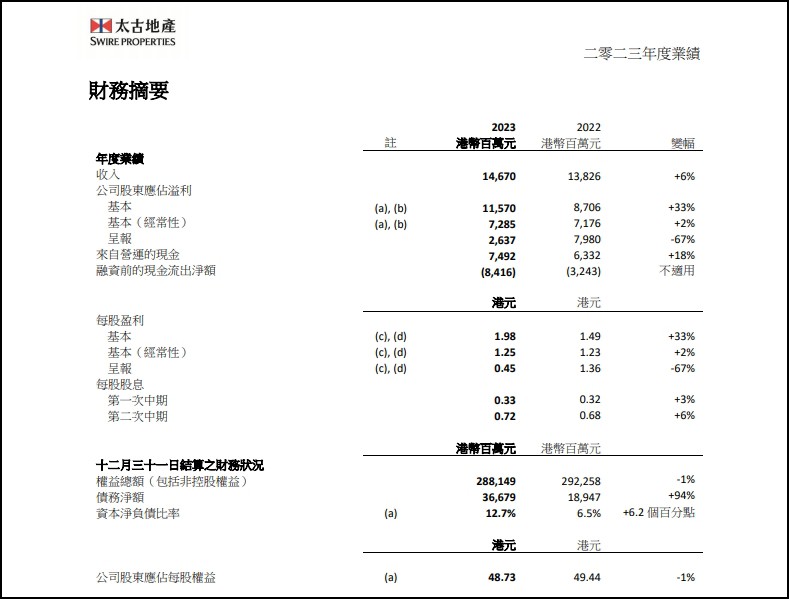 3月14日,太古地產(chǎn)發(fā)布2023年度業(yè)績(jī)顯示,截至2023年12月31日止年度,太古地產(chǎn)總收入達(dá)146.7億港元,同比增長(zhǎng)6%;股東應(yīng)占溢利為26.37億港元,同比大幅下滑67%。 太古地產(chǎn)表示,中國(guó)內(nèi)地繼續(xù)是全球重要的經(jīng)濟(jì)增長(zhǎng)引擎。太古地產(chǎn)目前在內(nèi)地4個(gè)主要城市營(yíng)運(yùn)6個(gè)國(guó)際級(jí)項(xiàng)目,另有5個(gè)大型新項(xiàng)目正在發(fā)展中。該集團(tuán)目標(biāo)在2032年前將中國(guó)內(nèi)地的總樓面面積增加一倍。 財(cái)報(bào)顯示,太古地產(chǎn)正在一線和新興一線城市發(fā)展的5個(gè)新項(xiàng)目。其中成都太古里項(xiàng)目完成剩余權(quán)益收購(gòu),成為太古地產(chǎn)在中國(guó)內(nèi)地的零售旗艦項(xiàng)目;2023年11月,西安太古里項(xiàng)目動(dòng)工,是太古地產(chǎn)在西安首個(gè)項(xiàng)目,旨在建造國(guó)際級(jí)文化地標(biāo);位于三亞市海棠灣的零售項(xiàng)目是太古地產(chǎn)首個(gè)度假式購(gòu)物商場(chǎng);北京頤堤港二期正在發(fā)展階段,除了七座辦公樓,亦提供時(shí)尚酒店及創(chuàng)意零售概念;上海布局兩座新項(xiàng)目,分別為與前灘太古里僅一街之隔的前灘綜合發(fā)展項(xiàng)目,以及位于黃浦江畔的洋涇綜合發(fā)展項(xiàng)目。 此前,太古地產(chǎn)在2022年3月宣布,計(jì)劃在未來(lái)十年投資1000億港元,在香港和內(nèi)地發(fā)展一系列項(xiàng)目,同時(shí)在不同地區(qū)開展一系列住宅買賣項(xiàng)目。截至2024年3月8日,已承諾的投資計(jì)劃總額約為580億港元,其中110億港元于香港、370億港元于中國(guó)內(nèi)地和100億港元于住宅物業(yè)買賣項(xiàng)目。尚未落實(shí)的項(xiàng)目包括在中國(guó)內(nèi)地一線及新興一線城市更多以零售為主導(dǎo)的綜合發(fā)展項(xiàng)目,包括廣州及北京。 |