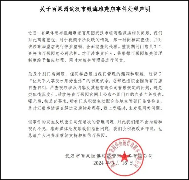 3月16日,百果園武漢官微發(fā)布《關于百果園武漢市銀海雅苑店事件處理聲明》稱,近日,有媒體發(fā)布視頻曝光百果園武漢市銀海雅苑店相關問題,公司對此高度重視,對于視頻中所反映的情況,已第一時間核實查證,并對該涉事加盟店進行停業(yè)整頓、全面徹查的處理。 整改期間門店員工工資將由百果園總公司承擔。對于涉事責任人,將根據(jù)百果園相關管理制度給予相應處理,同時對相關管理層進行問責。 此外,聲明提及,總部已組織全國所有門店自查自糾,嚴查視頻涉及內容及其他有違公司管理規(guī)定的問題,避免類似情況發(fā)生,后續(xù)將在百果園官網(wǎng)上公布全國門店的自查自糾報告。 |