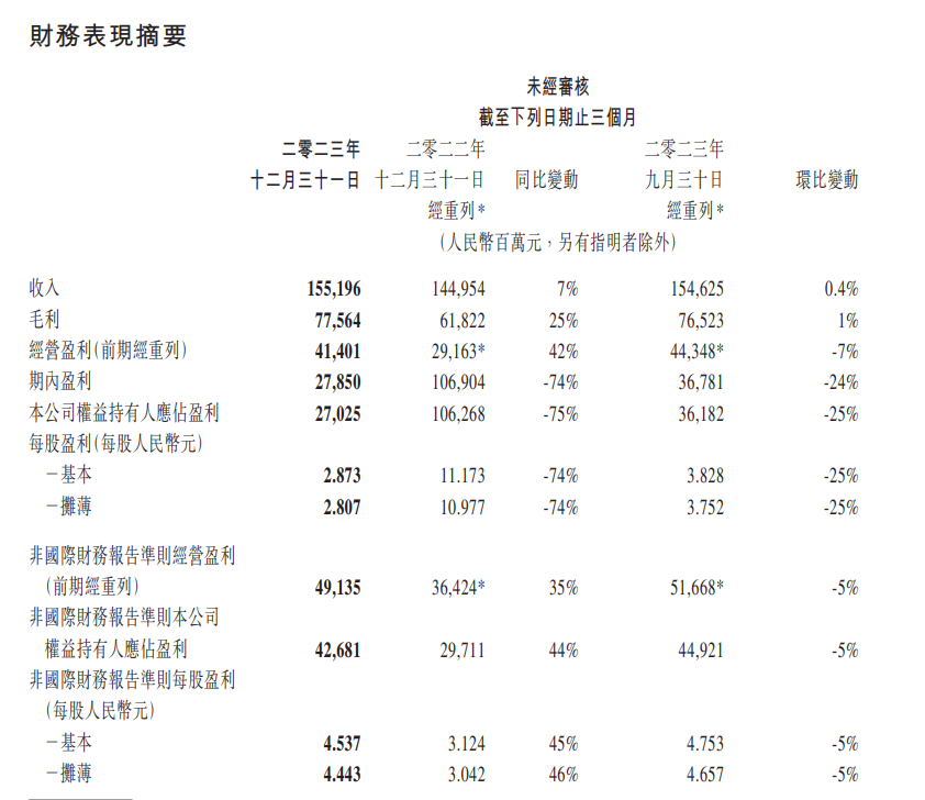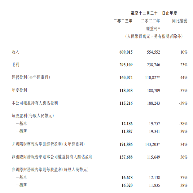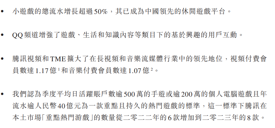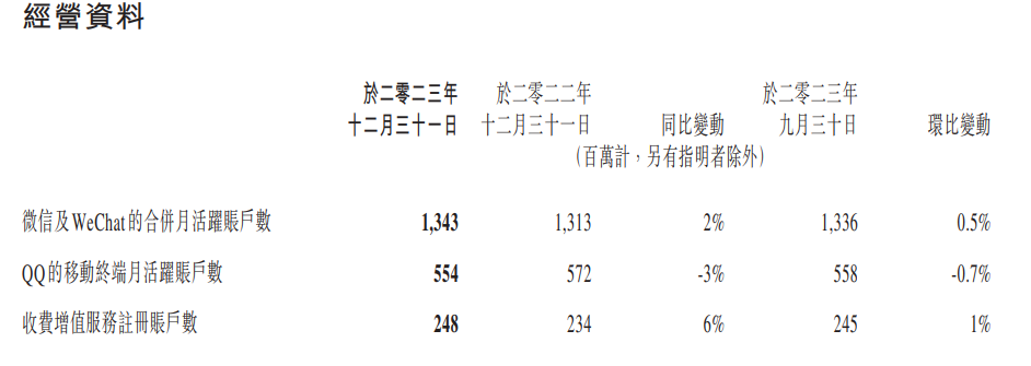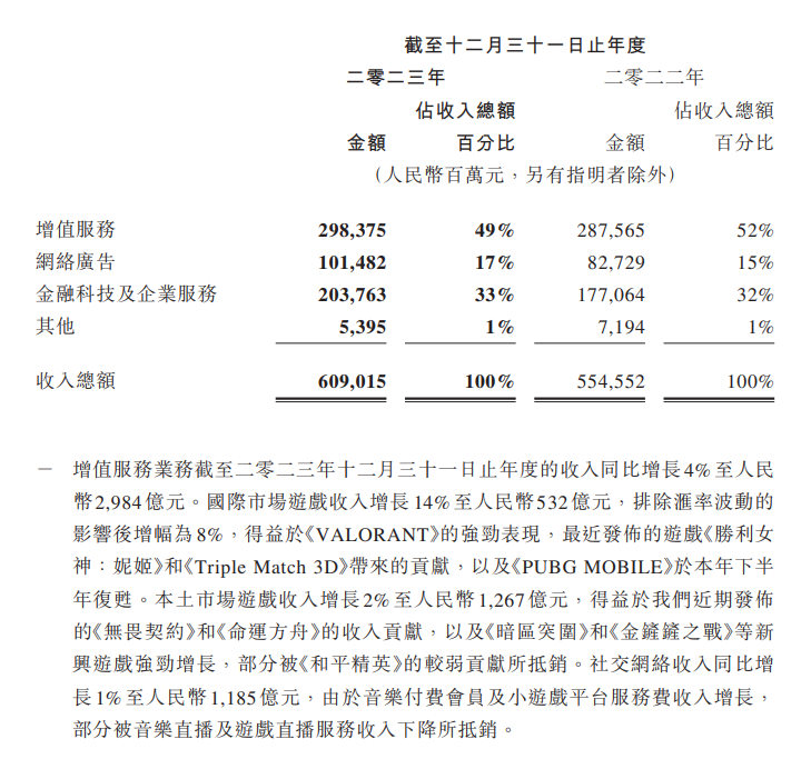 3月20日,騰訊控股(00700.HK)發(fā)布2023年第四季度及全年財(cái)報(bào)。 騰訊2023年全年總收入6090.15億元 財(cái)報(bào)顯示,2023年全年方面,騰訊總收入為人民幣6090.15億元,同比增長(zhǎng)10%;凈利潤(rùn)1152.16億元,同比下降39%;經(jīng)調(diào)整后凈利潤(rùn)為1576.88億元,同比增長(zhǎng)36%。 騰訊2023年第四季度總收入為人民幣1551.96億元,同比增長(zhǎng)7%;凈利潤(rùn)270.25億元,同比下降75%;經(jīng)調(diào)整后凈利潤(rùn)為426.81億元,同比增長(zhǎng)44%。 經(jīng)調(diào)整凈利是指,按非國(guó)際財(cái)務(wù)報(bào)告準(zhǔn)則,權(quán)益持有人應(yīng)占盈利(Non-IFRS凈利潤(rùn))撇除若干一次性及/或非現(xiàn)金項(xiàng)目的影響,以反映核心業(yè)務(wù)的表現(xiàn)。 微信及WeChat月活13.43億 視頻號(hào)總用戶使用時(shí)長(zhǎng)翻番 財(cái)報(bào)顯示,截至2023年12月31日,微信及WeChat合并月活賬戶數(shù)13.43億,同比增長(zhǎng)2%;QQ移動(dòng)終端月活賬戶數(shù)5.54億,同比下滑3%;收費(fèi)增值服務(wù)注冊(cè)賬戶數(shù) 2.48億,同比增長(zhǎng)6%。 視頻號(hào)2023年用戶使用時(shí)長(zhǎng)增長(zhǎng)翻倍。小程序、小游戲和微信搜索等同樣展現(xiàn)強(qiáng)勁勢(shì)頭,小游戲流水年增長(zhǎng)超50%,微信搜索日活躍用戶數(shù)破1億,微信生態(tài)進(jìn)一步展現(xiàn)強(qiáng)大的活力和商業(yè)價(jià)值。 2023年全年業(yè)務(wù)數(shù)據(jù) 財(cái)報(bào)顯示,增值服務(wù)業(yè)務(wù)年收入同比增長(zhǎng)4%至2984億元。國(guó)際市場(chǎng)游戲收入增長(zhǎng)14%至532億元,排除匯率波動(dòng)的影響后增幅為8%,本土市場(chǎng)游戲收入增長(zhǎng)2%至1267億元,得益于近期發(fā)布的《無(wú)畏契約》和《命運(yùn)方舟》的收入貢獻(xiàn),以及《暗區(qū)突圍》和《金鏟鏟之戰(zhàn)》等新興游戲強(qiáng)勁增長(zhǎng),部分被《和平精英》的較弱貢獻(xiàn)所抵銷。社交網(wǎng)絡(luò)收入同比增長(zhǎng)1%至1185億元,由于音樂(lè)付費(fèi)會(huì)員及小游戲平臺(tái)服務(wù)費(fèi)收入增長(zhǎng),部分被音樂(lè)直播及游戲直播服務(wù)收入下降所抵銷。 網(wǎng)絡(luò)廣告方面,年度收入同比增長(zhǎng)23%至1015億元,該增長(zhǎng)受視頻號(hào)及微信搜一搜的新廣告庫(kù)存以及騰訊的廣告平臺(tái)持續(xù)升級(jí)所帶動(dòng)。除了汽車行業(yè)外,所有重點(diǎn)廣告主行業(yè)在騰訊廣告平臺(tái)上的廣告開(kāi)支均有所增加,其中消費(fèi)品、互聯(lián)網(wǎng)服務(wù)及大健康行業(yè)的開(kāi)支顯著增加。 金融科技及企業(yè)服務(wù)業(yè)務(wù)方面,年度收入同比增長(zhǎng)15%至2038億元。金融科技服務(wù)收入實(shí)現(xiàn)了雙位數(shù)增長(zhǎng),得益于支付活動(dòng)增加及理財(cái)服務(wù)收入增長(zhǎng)。企業(yè)服務(wù)收入也實(shí)現(xiàn)了雙位數(shù)增長(zhǎng),得益于視頻號(hào)帶貨技術(shù)服務(wù)費(fèi)的收取以及云服務(wù)的穩(wěn)步增長(zhǎng)。 騰訊宣布 2024年回購(gòu)不少于1000億港元 騰訊控股表示,建議派發(fā)的末期股息為每股3.40港元,較上一年度的2.40港元有所增長(zhǎng),增幅為42%。 董事會(huì)已批準(zhǔn)2024年1000億港元回購(gòu)計(jì)劃。自2005年回購(gòu)以來(lái),這是騰訊首次在財(cái)報(bào)中披露當(dāng)年回購(gòu)計(jì)劃。財(cái)報(bào)顯示,2023年,騰訊回購(gòu)金額490億港元,超過(guò)去十年回購(gòu)金額總和。騰訊最近兩年持續(xù)強(qiáng)有力的回購(gòu)不僅是對(duì)投資者負(fù)責(zé)任的回饋,更是代表了對(duì)公司長(zhǎng)期價(jià)值的認(rèn)可和未來(lái)前景的信心。 |