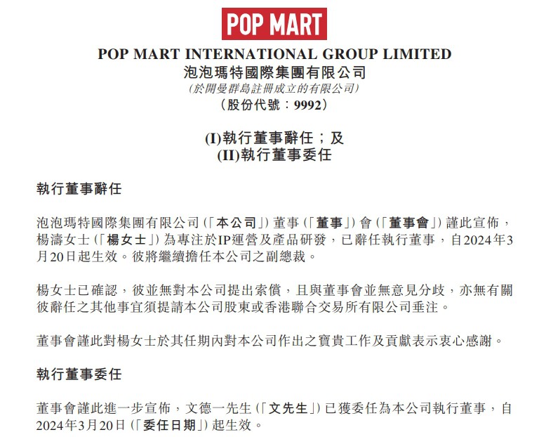 3月20日,泡泡瑪特國際集團(tuán)有限公司發(fā)布董事變動(dòng)公告。 楊濤因個(gè)人原因已辭任其于該公司的執(zhí)行董事職務(wù),辭任即日生效。同時(shí),泡泡瑪特國際集團(tuán)有限公司亦宣布文德一執(zhí)行董事委任。新任執(zhí)行董事具備豐富的行業(yè)經(jīng)驗(yàn)和管理能力,將為公司帶來新的發(fā)展機(jī)遇。委任即日起生效,任期將與該公司下屆股東周年大會(huì)結(jié)束時(shí)屆滿,并符合資格重選連任。 資料顯示,文德一先生,45歲,現(xiàn)為本公司副總裁兼國際業(yè)務(wù)總裁。文先生于2018年8月加入本集團(tuán),負(fù)責(zé)監(jiān)察本公司海外業(yè)務(wù)部。在此之前,文先生于2013年7月至2018年7月先后擔(dān)任CJCheilJedangCorporation業(yè)務(wù)發(fā)展部全球業(yè)務(wù)規(guī)劃專員、全球業(yè)務(wù)規(guī)劃高級(jí)專員及全球業(yè)務(wù)規(guī)劃襄理,及于2009年1月至2013年5月?lián)蜟JENM全球戰(zhàn)略部經(jīng)理。2004年12月至2008年12月,文先生任職于LotteCinemaCo.,Ltd規(guī)劃管理部。文先生于2005年2月獲得韓國建國大學(xué)中文學(xué)士學(xué)位,并于2018年7月獲得中國北京大學(xué)工商管理碩士學(xué)位。 |