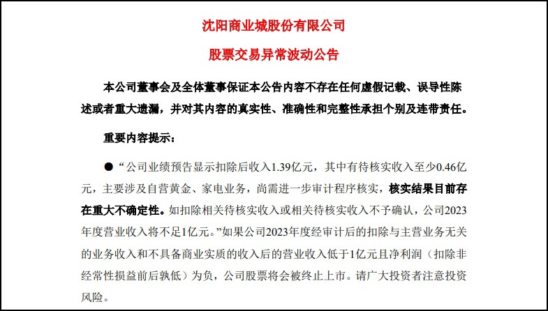 3月20日,沈陽商業(yè)城股份有限公司發(fā)布股票交易異常波動公告,披露了公司2023年度業(yè)績預(yù)告及相關(guān)業(yè)務(wù)情況。 據(jù)公告,該公司預(yù)計2023年度營業(yè)收入為1.39億元,但其中有待核實的收入至少0.46億元,主要涉及自營黃金和家電業(yè)務(wù)。若扣除待核實收入或不予確認(rèn),則2023年度營業(yè)收入將低于1億元。 同時,公告還披露了公司自營黃金業(yè)務(wù)和家電業(yè)務(wù)的具體情況。在自營黃金業(yè)務(wù)中,部分客戶消費大額、高頻或異地開戶交易,涉及金額約2522萬元。而在自營家電業(yè)務(wù)中,公司接受供應(yīng)商免費倉儲、物流服務(wù),部分商品由供應(yīng)商直發(fā)客戶,涉及金額約2065萬元。這些情況也增加了公司營業(yè)收入的不確定性。 公告還提到公司近六年四次籌劃重大資產(chǎn)重組均未果,且近三個會計年度連續(xù)虧損,最近一年審計報告顯示持續(xù)經(jīng)營能力存疑。這些情況表明,公司的財務(wù)狀況和未來發(fā)展前景都面臨較大的挑戰(zhàn)。 公司控股股東和實際控制人曾承諾注入優(yōu)質(zhì)資產(chǎn),但至今無進(jìn)展。這一承諾的落空也進(jìn)一步加劇了公司的經(jīng)營困境。 |