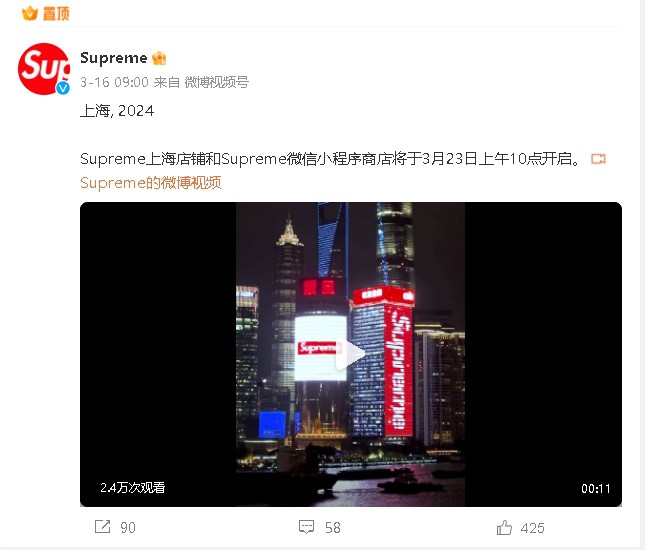 近日,美國潮牌Supreme在微博宣布,上海店鋪將于3月23日上午開業(yè),這也是其在中國首家正式門店,全球范圍的第17家門店。屆時,Supreme官方微信小程序也將同步上線。 據(jù)了解,Supreme上海店將開在富民路291號的悟景世紀大樓。之前有網(wǎng)友在小紅書上爆料,目前該地址一層和二層的沿街鋪位已經(jīng)豎起大型圍擋,但未標明即將入駐的品牌,開店細節(jié)仍待明確,預計2024年開業(yè)。 今年3月,有網(wǎng)友曬出,位于富民路的Supreme外圍正式圍起了Supreme的LOGO,Supreme中國首都落地上海消息終于得到“證實”。如今,Supreme亦正式官宣店鋪開業(yè)時間。 目前,Supreme在全球范圍共開設了16家門店,分布在美國、英國、法國、意大利、德國及日本、韓國,而Supreme上海將成為全球第17家門店。 |