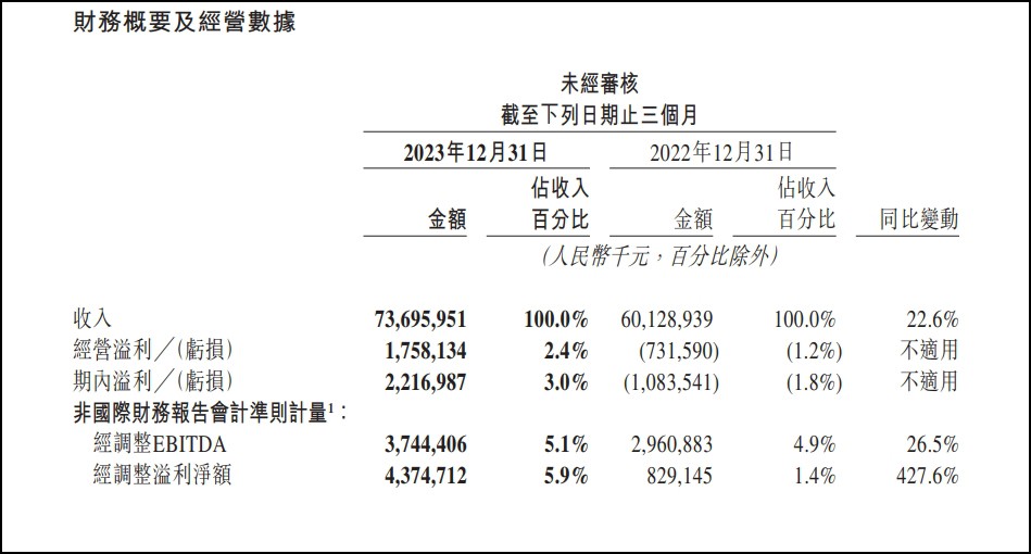 3月22日晚,美團(tuán)發(fā)布2023年第四季度及全年業(yè)績(jī)。 第四季度,美團(tuán)營(yíng)收737億元,同比增長(zhǎng)22.6%;凈利潤(rùn)22億元,而2022年同期虧損11億元;調(diào)整后凈利潤(rùn)43.7億元,而去年同期為8.3億元。 2023全年,美團(tuán)營(yíng)收2767億元,同比增長(zhǎng)26%,凈利潤(rùn)139億元,而2022年虧損67億元;經(jīng)調(diào)凈利潤(rùn)為232.5億元,而去年同期為28.3億元。全年研發(fā)支出達(dá)212億元,創(chuàng)歷史新高。美團(tuán)CEO王興表示,公司將持續(xù)加大對(duì)中國(guó)消費(fèi)市場(chǎng)及科技研發(fā)的投入力度,用科技推動(dòng)生活服務(wù)各行業(yè)效率提升。 財(cái)報(bào)顯示,2023年公司核心本地商業(yè)穩(wěn)步發(fā)展,該業(yè)務(wù)分部營(yíng)收達(dá)2069億元,同比增長(zhǎng)29%;實(shí)現(xiàn)經(jīng)營(yíng)利潤(rùn)387億元,同比增長(zhǎng)31%。其中外賣業(yè)務(wù)繼續(xù)高質(zhì)量發(fā)展,外賣年度活躍商戶數(shù)再創(chuàng)新高;年度交易用戶持續(xù)增長(zhǎng),中高頻用戶群體規(guī)模及其購(gòu)買頻次穩(wěn)步提升。即時(shí)配送訂單數(shù)達(dá)219億筆,同比增長(zhǎng)24%。 財(cái)報(bào)顯示,2023年第四季度,美團(tuán)新業(yè)務(wù)分部的收入同比增長(zhǎng)11.5%至186億元。經(jīng)營(yíng)虧損同比收窄24.1%至48億元,經(jīng)營(yíng)虧損率環(huán)比收窄至26.0%。2023年全年,美團(tuán)新業(yè)務(wù)分部的收入同比增長(zhǎng)18.0%至698億元。經(jīng)營(yíng)虧損同比收窄至202億元,經(jīng)營(yíng)虧損率繼續(xù)改善至28.9%。 到店酒旅業(yè)務(wù)線下消費(fèi)需求反彈顯著,節(jié)假日預(yù)訂量創(chuàng)下歷史新高,全年總交易額同比增長(zhǎng)超過(guò)100%。年交易用戶增長(zhǎng)超30%、年活躍商戶增長(zhǎng)超60%,均創(chuàng)歷史新高。新業(yè)務(wù)方面,商品零售業(yè)務(wù)效率持續(xù)改善。2023年全年收入上升至698億元,第四季度經(jīng)營(yíng)虧損同比收窄24%至48億元。 “因吃而動(dòng),尋味而游”的“味蕾游”成當(dāng)下旅游消費(fèi)新趨勢(shì),越來(lái)越多小眾地區(qū)因特色美食變身旅游目的地,帶動(dòng)本地生活服務(wù)消費(fèi)整體增長(zhǎng)。線上平臺(tái)也緊跟消費(fèi)趨勢(shì)、把握假日節(jié)點(diǎn),聯(lián)動(dòng)旅游、餐飲商家助燃線下消費(fèi)。 美團(tuán)、大眾點(diǎn)評(píng)數(shù)據(jù)顯示,2023年國(guó)慶假期,汕頭、潮州、臺(tái)州、揚(yáng)州等地,由異地消費(fèi)者貢獻(xiàn)的堂食訂單量較2019年增長(zhǎng)均超500%,汕尾、潮州、延吉、柳州、淄博等地的休閑玩樂(lè)訂單增幅超600%。 公司也在持續(xù)探索用科技助力零售服務(wù)創(chuàng)新。截至2023年底,美團(tuán)無(wú)人機(jī)已累計(jì)完成訂單超22萬(wàn)單,覆蓋辦公、社區(qū)、高校、景區(qū)、市政公園、醫(yī)療等多場(chǎng)景。2024年春節(jié)假期,深圳人才公園部分周邊商家超8成外賣訂單均由無(wú)人機(jī)配送完成,帶動(dòng)多種商品銷量環(huán)比“十一”假期增長(zhǎng)超5倍。 |