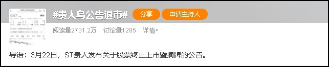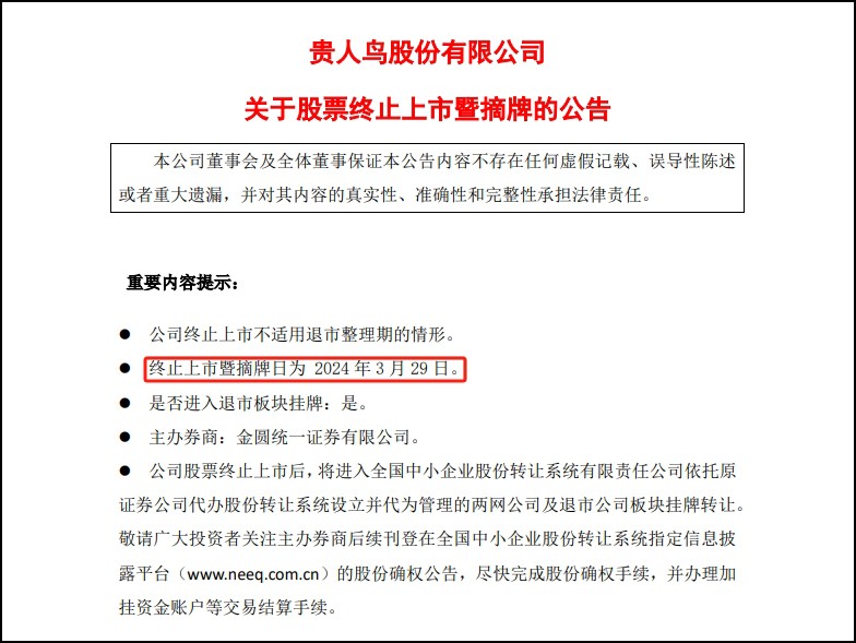 3月23日,#貴人鳥公告退市#話題沖上微博熱搜。 01 貴人鳥公告退市 3月22日,ST貴人發(fā)布公告稱,公司收到上交所《關(guān)于貴人鳥股份有限公司股票終止上市的決定》,上交所決定終止公司股票上市。 圖來源:ST貴人公告。 由于交易類強(qiáng)制退市公司股票不進(jìn)入退市整理期交易,上交所在公告上市公司股票終止上市決定之日后5個(gè)交易日內(nèi)對(duì)其予以摘牌,即ST貴人的終止上市暨摘牌日為3月29日。公司股票被終止上市后,將進(jìn)入全國(guó)中小企業(yè)股份轉(zhuǎn)讓系統(tǒng)掛牌轉(zhuǎn)讓。 此前公司股票連續(xù)跌破面值,由此觸及交易類退市指標(biāo)。據(jù)悉,2024年2月1日至2024年3月7日,ST貴人股票連續(xù)20個(gè)交易日的每日股票收盤價(jià)均低于1元。根據(jù)相關(guān)規(guī)則,上交所決定終止公司股票上市。 截至停牌前,ST貴人股價(jià)定格在0.67元/股,公司市值僅剩約11億元。截至去年9月末,ST貴人股東總戶數(shù)約有2.9萬戶。 02 昔日“鞋王”預(yù)虧損近5億元 作為A股運(yùn)動(dòng)鞋服第一股,ST貴人是昔日的“鞋王”,也曾助力創(chuàng)始人成為福建泉州首富,但在盲目擴(kuò)張、投資失利等影響下,這場(chǎng)十年的上市之旅終成“黃粱一夢(mèng)”。 公開資料顯示,ST貴人主要從事“貴人鳥”品牌運(yùn)動(dòng)鞋服的研發(fā)、生產(chǎn)和銷售,2014年1月登陸A股市場(chǎng),股票簡(jiǎn)稱“貴人鳥”,成為中國(guó)A股運(yùn)動(dòng)鞋服第一股。 在上市后公司便開啟了瘋狂的擴(kuò)張模式,先后涉足投資、科技、足球經(jīng)紀(jì)業(yè)務(wù)、體育保險(xiǎn)、運(yùn)動(dòng)項(xiàng)目管理、健身等領(lǐng)域;與此同時(shí),高峰時(shí)期公司平均每天要新開3家實(shí)體店,實(shí)體門店數(shù)量一度超過5000家。 高速擴(kuò)張后,2015年公司市值接近400億元,其創(chuàng)始人林天福更是以190億元的身家摘得“泉州首富”。 不過,瘋狂擴(kuò)張的同時(shí),公司資產(chǎn)負(fù)債率也不斷上升,銷售收入和銷售利潤(rùn)還出現(xiàn)下降。2018年,公司營(yíng)業(yè)收入下降13.52%至28.12億元,且出現(xiàn)上市來首次虧損——?dú)w屬母公司股東的凈利潤(rùn)虧損6.86億元。緊接著,2019年,公司又虧損10.96億元,2020年再次虧損3.82億元。 2021年4月,糧食貿(mào)易流通業(yè)第三方供應(yīng)鏈服務(wù)平臺(tái)泰富金谷成為公司重整投資人。隨后,以運(yùn)動(dòng)鞋服起家的貴人鳥便開始了向糧食貿(mào)易轉(zhuǎn)型的道路。 2021年,貴人鳥扭虧為盈,歸屬于上市公司股東的凈利潤(rùn)3.6億元。 2022年公司再次出現(xiàn)虧損,當(dāng)年實(shí)現(xiàn)營(yíng)收21.08億元,歸屬母公司的凈利潤(rùn)虧損0.09億元。2023年9月,ST貴人稱將逐步退出運(yùn)動(dòng)鞋服業(yè)務(wù),以糧食業(yè)務(wù)作為未來主要經(jīng)營(yíng)發(fā)展方向。然而糧食業(yè)務(wù)的發(fā)展并不如意。 據(jù)ST貴人發(fā)布的業(yè)績(jī)預(yù)告,預(yù)計(jì)2023年實(shí)現(xiàn)歸屬于上市公司股東的凈利潤(rùn)-4.85億元,虧損幅度擴(kuò)大。 03 董事長(zhǎng)被立案調(diào)查 2024年2月23日,ST貴人公告稱,公司及實(shí)控人、董事長(zhǎng)李志華于2024年2月22日收到中國(guó)證監(jiān)會(huì)下發(fā)的《立案告知書》,因涉嫌信息披露違法違規(guī),中國(guó)證監(jiān)會(huì)決定對(duì)公司、李志華立案。 據(jù)了解,2022年8月,貴人鳥法定代表人變?yōu)樘└唤鸸鹊姆ǘù砣死钪救A,李志華任公司董事長(zhǎng)。此后,李志華一直在貴人鳥任職。今年2月辭任總經(jīng)理后,仍擔(dān)任公司董事長(zhǎng)。 早在2023年8月,時(shí)任貴人鳥董事長(zhǎng)李志華、總經(jīng)理林思萍、財(cái)務(wù)總監(jiān)周文鳳,因2022年業(yè)績(jī)預(yù)告信息披露不準(zhǔn)確,被福建證監(jiān)局出具警示函。 2023年1月,公司預(yù)告其歸母凈利潤(rùn)及扣非凈利潤(rùn)分別為7476.92萬元、1.58億元;同年4月,公司更正業(yè)績(jī),將歸母凈利潤(rùn)更正為-941.37萬元、扣非凈利潤(rùn)更正為6936.83萬元。 2024年1月,貴人鳥又收到福建證監(jiān)局下發(fā)的《行政監(jiān)管措施決定書》。其中提到,公司實(shí)際控制人兼董事長(zhǎng)、總經(jīng)理李志華間接控制了黑龍江誠(chéng)運(yùn)糧屹玉米購(gòu)銷有限公司、龍江月盛利糧食有限公司、齊齊哈爾市榮鼎糧食有限公司、甘南縣玉弘糧食購(gòu)銷有限公司等4家公司,ST貴人與上述4家公司在2021年至2023年間發(fā)生采購(gòu)交易分別為2401.30萬元、73490.17萬元、12091.72萬元,但未按規(guī)定及時(shí)披露關(guān)聯(lián)交易。 |